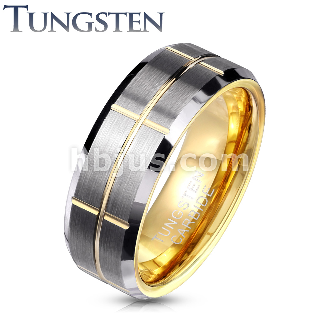 Brushed Center Gold Cross Grooved Beveled Edges Tungsten Carbide Rings
