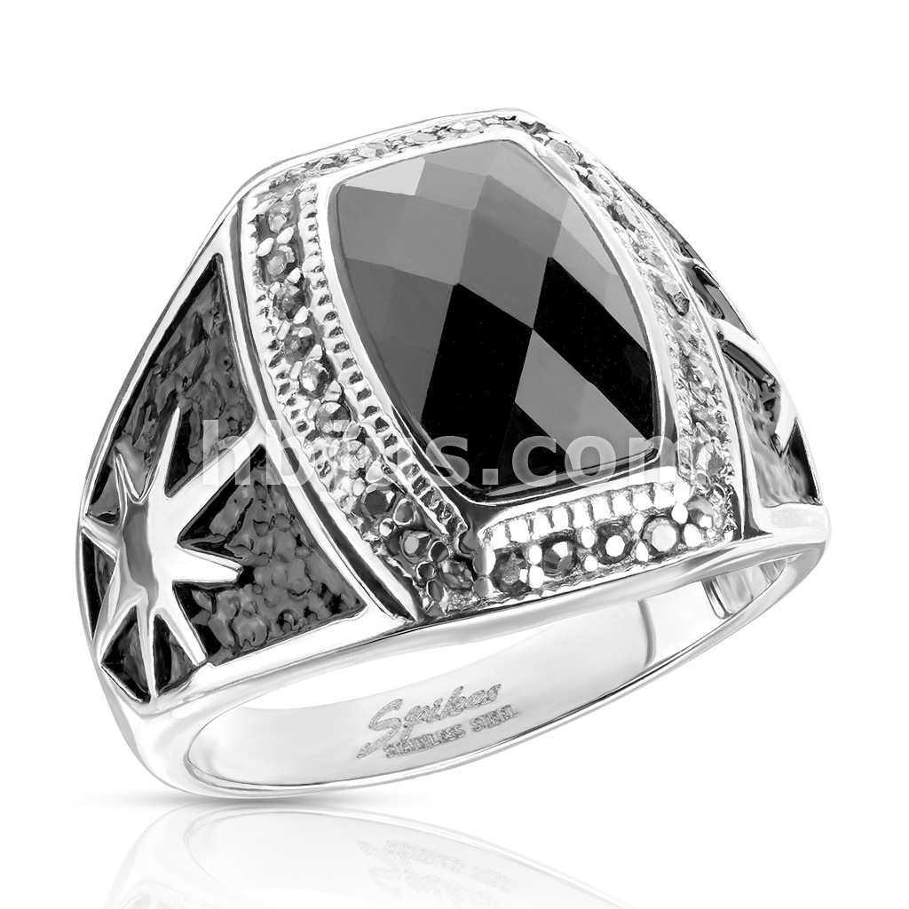 Black Faceted Stone with Sun Burst Sides Stainless Steel Ring