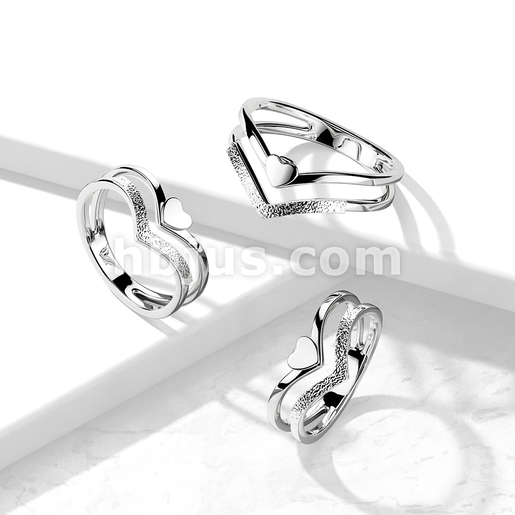 Double Chevron with Heart and Sand Blast Front Stainless Steel Ring