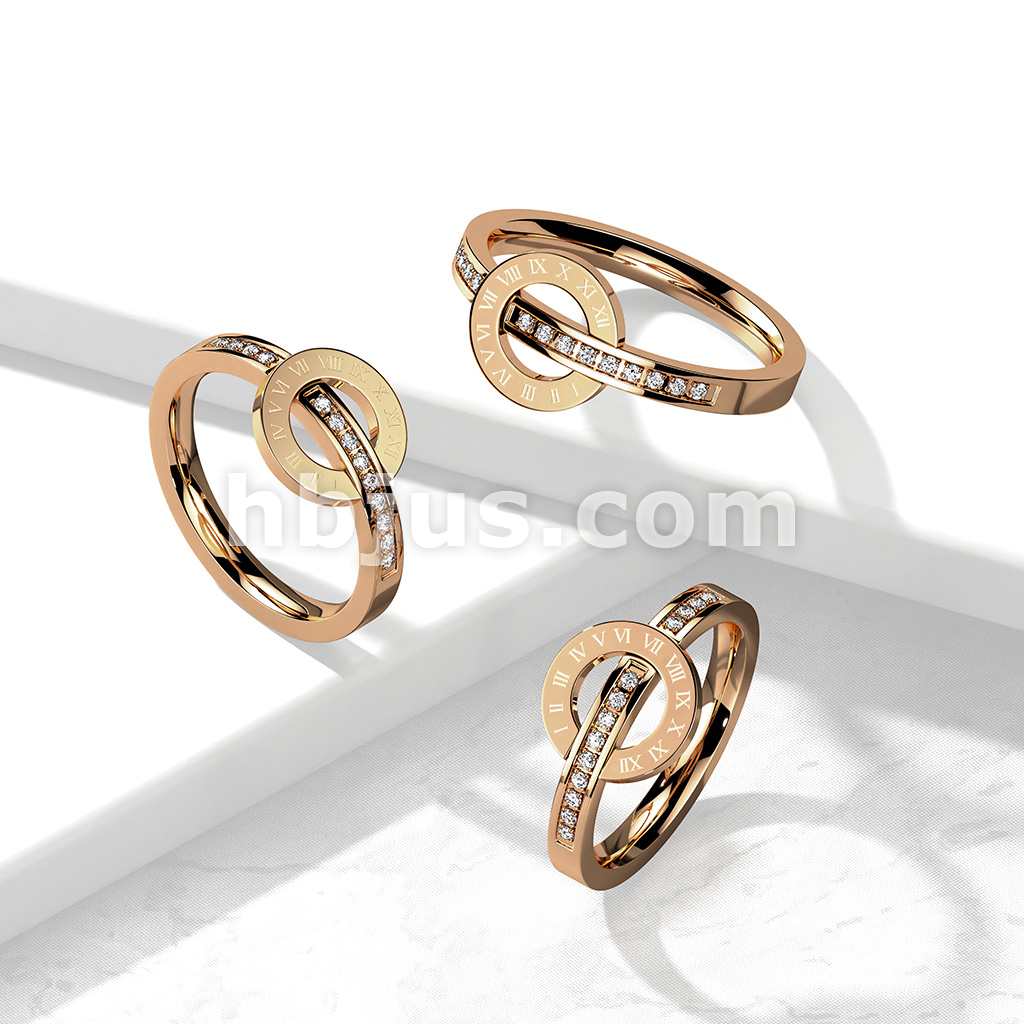 Roman Numeral Circle with Single Lined CZ Rose Gold Stainless Steel Ring