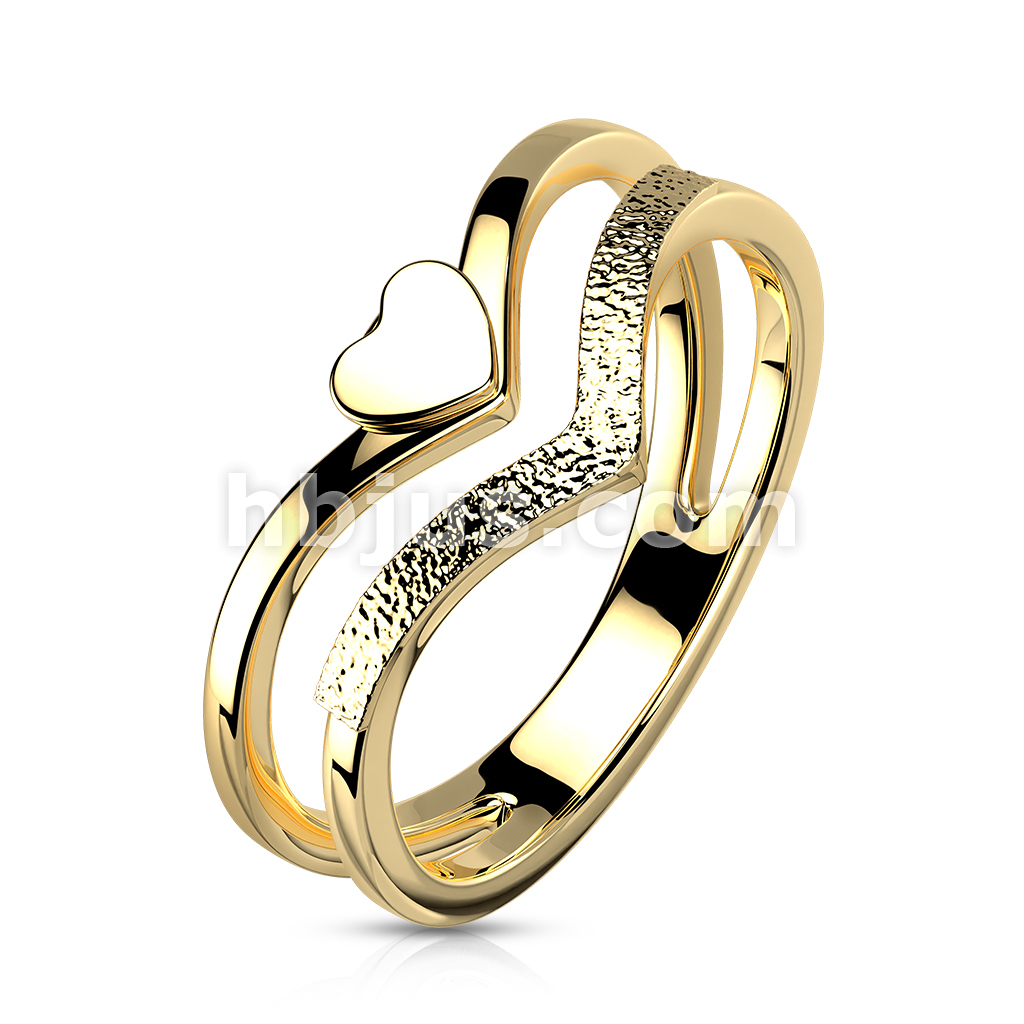 Double Chevron with Gold PVD Heart and Sand Blast Front Stainless Steel Ring
