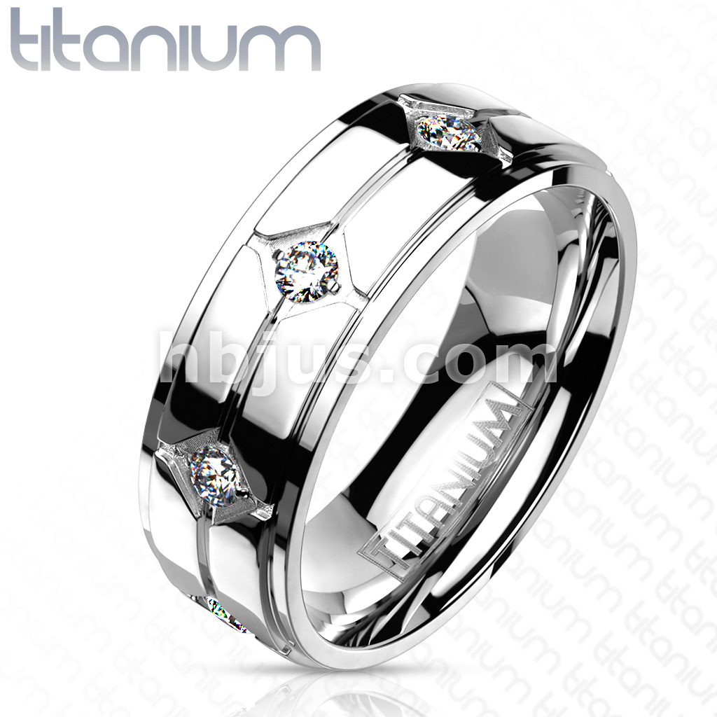Solid Titanium Ring With Diamond Shaped Grooves and CZ Centers
