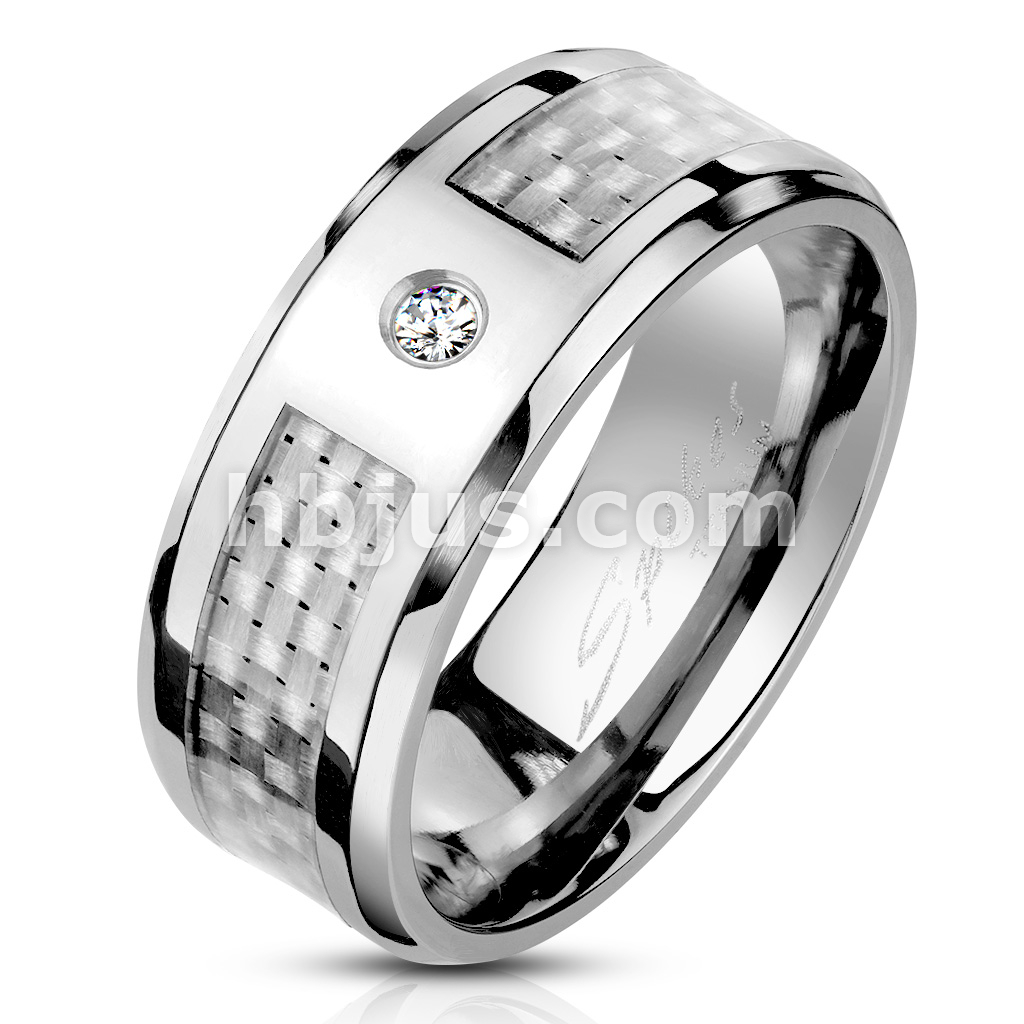 White Silver Carbon Fiber Inlay CZ Center Band Ring Solid Titanium