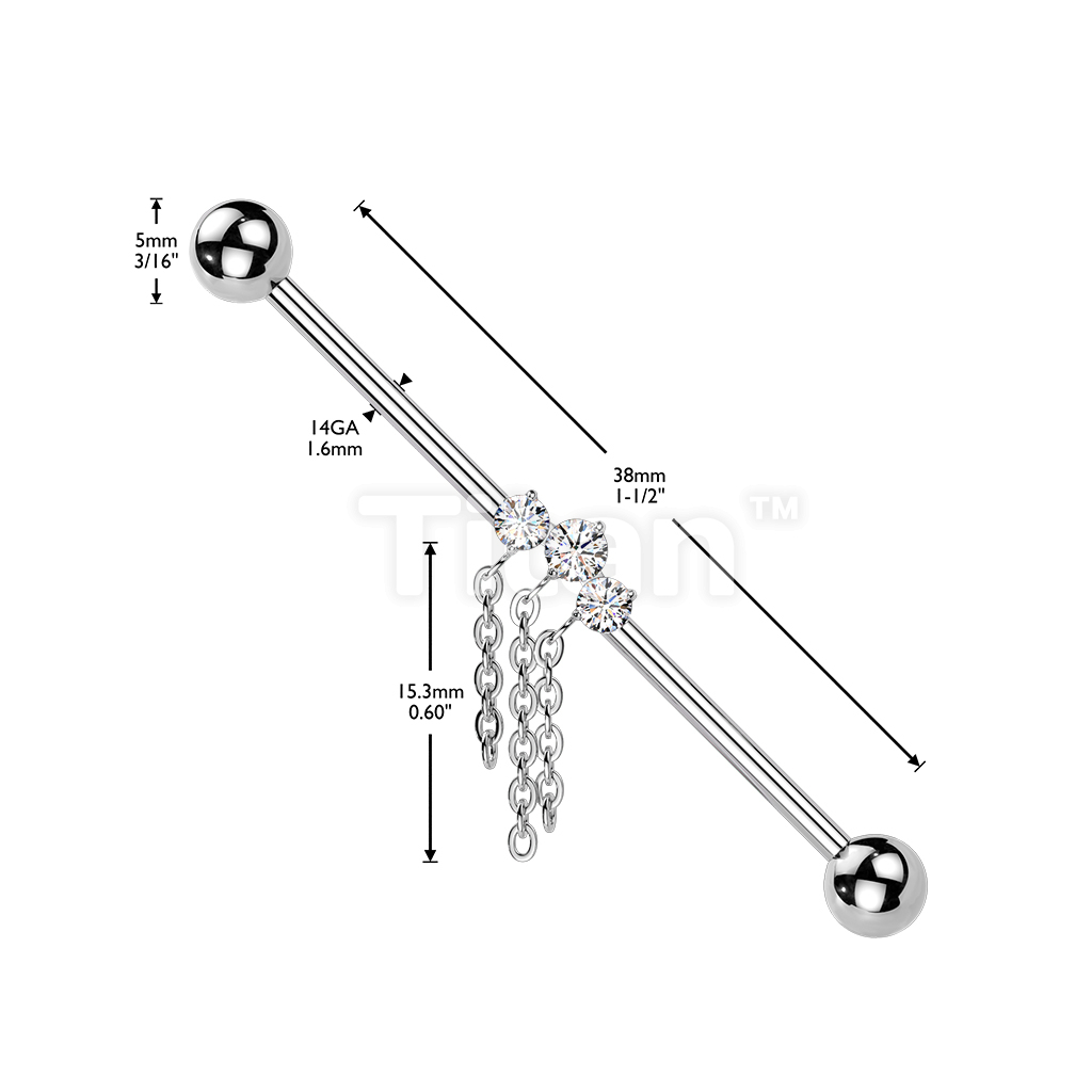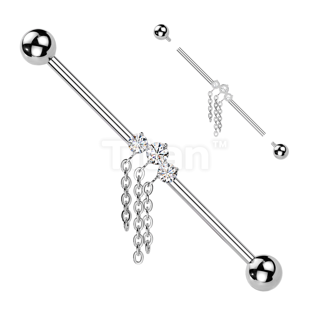 Titanium Internally Threaded 3 CZ With Triple Chain Dangle Industrial Barbell