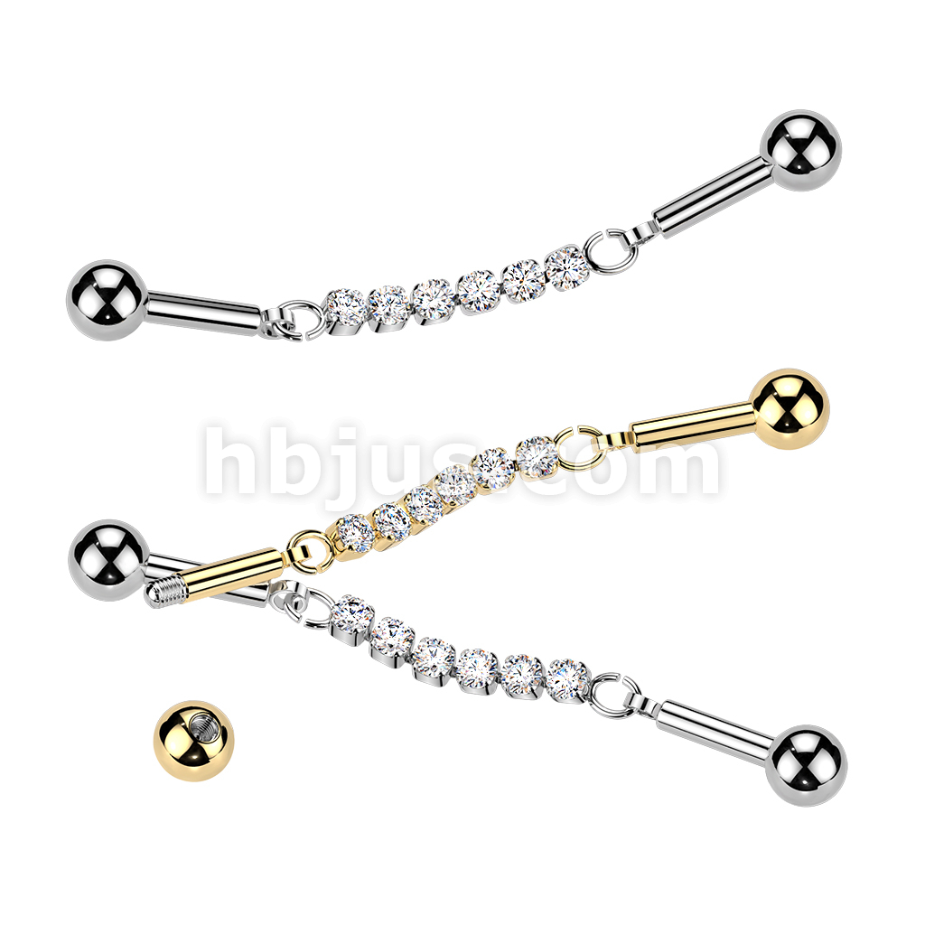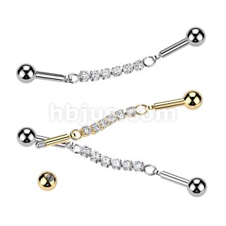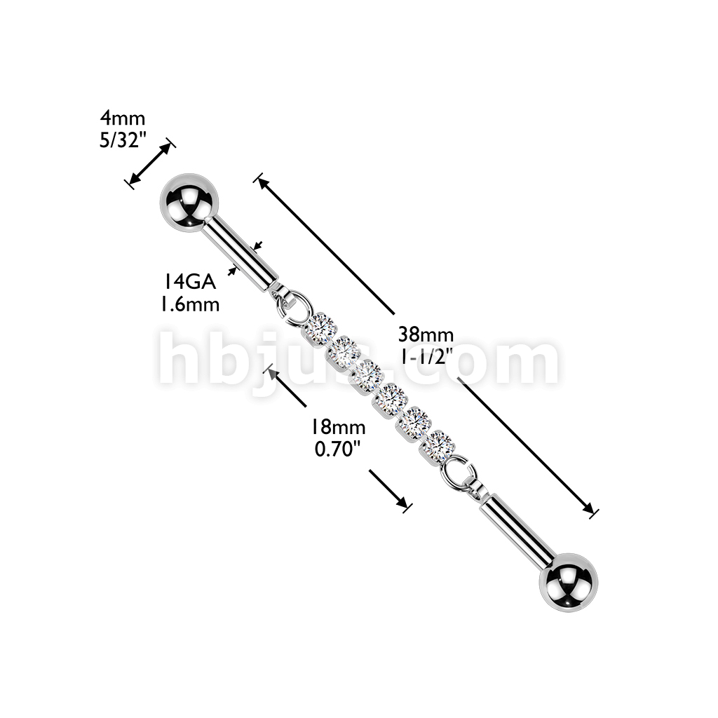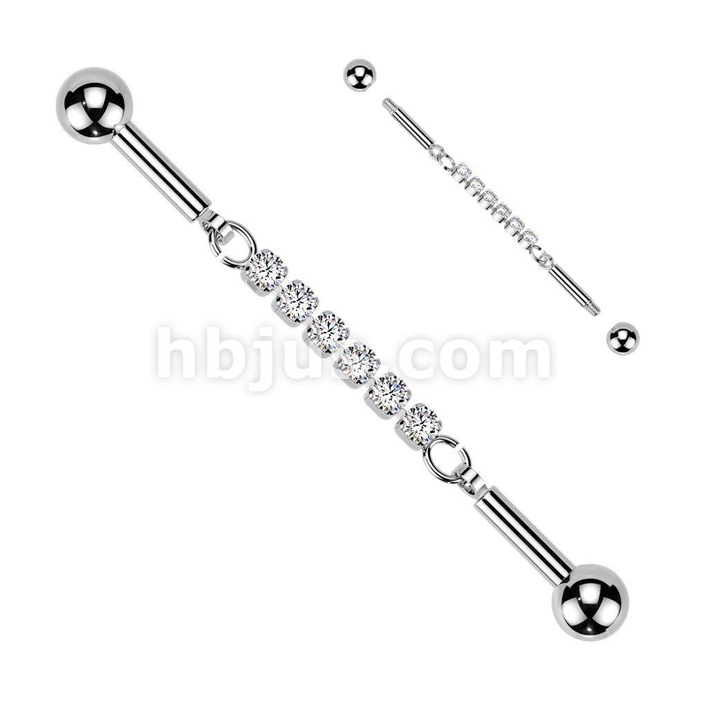 316L Industrial Barbell With Centered 6 Crystal Connector Chain