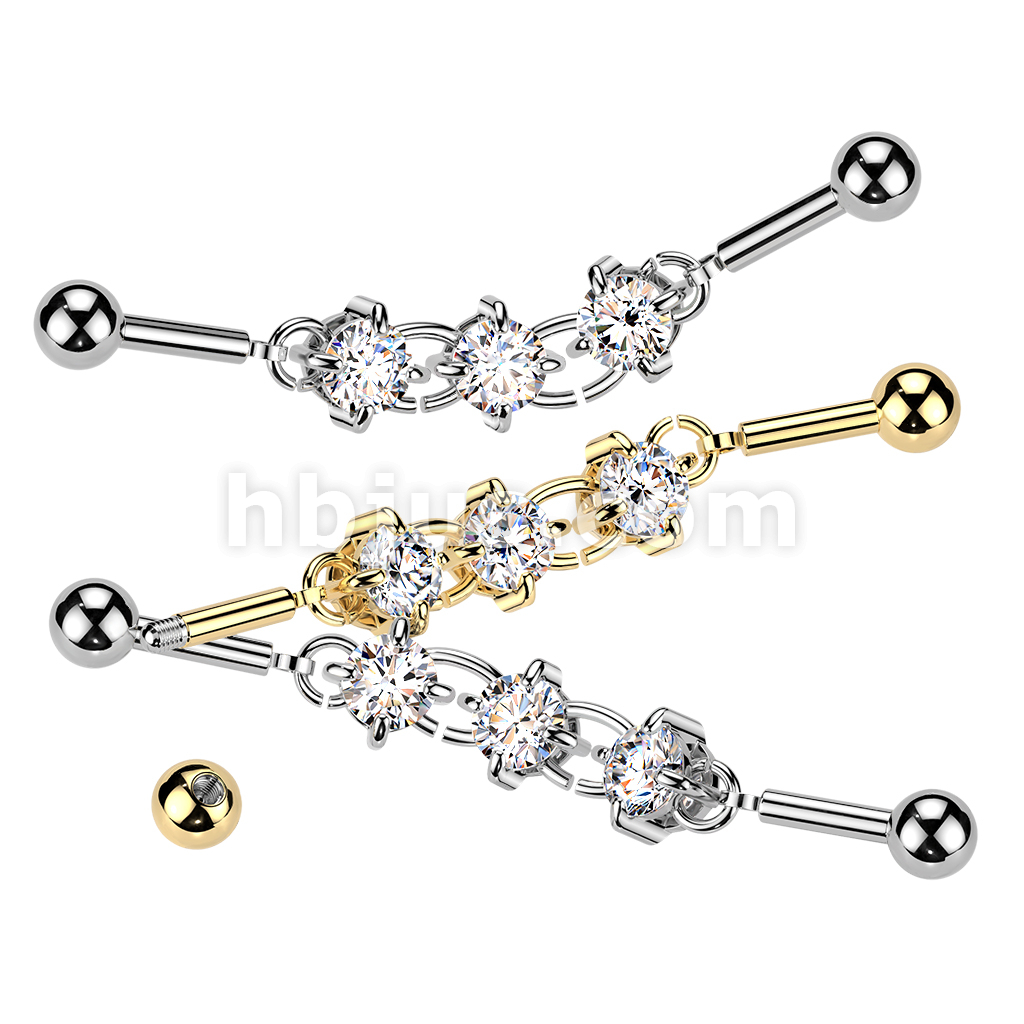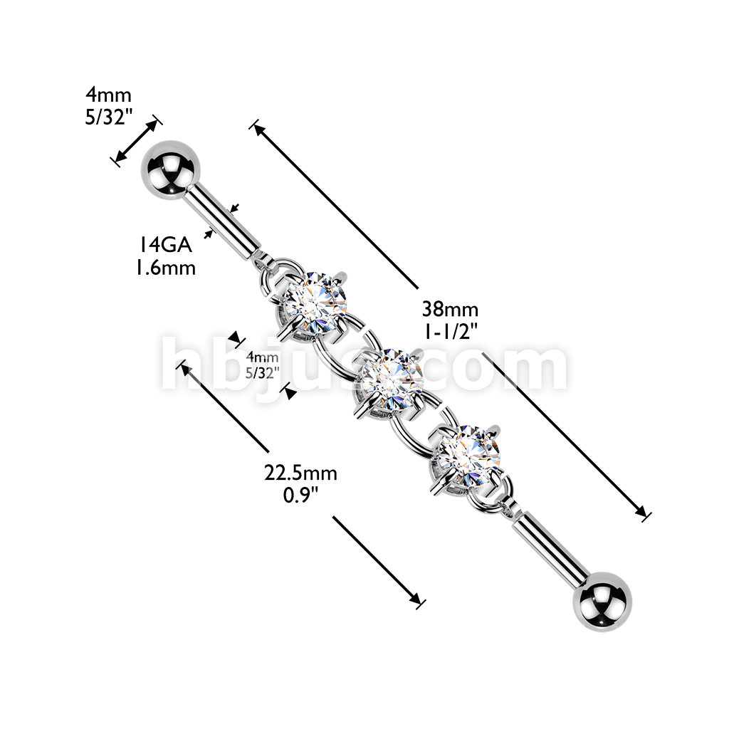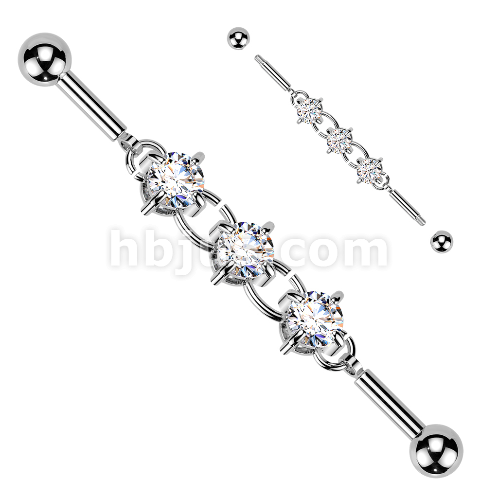 316L Industrial Barbell With Centered 3 Round Prong Set CZ Connector Chain