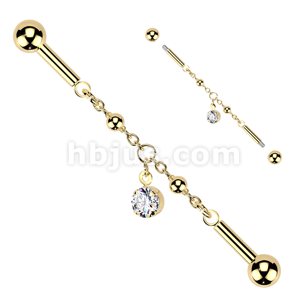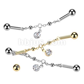 316L Industrial Barbell With Centered Connector Chain & Prong Set CZ Dangle
