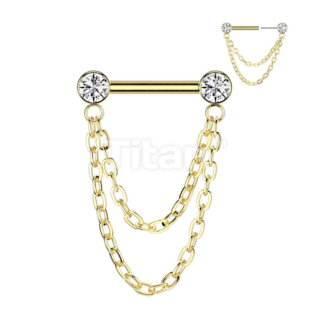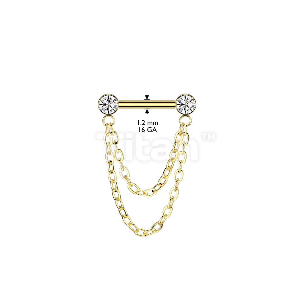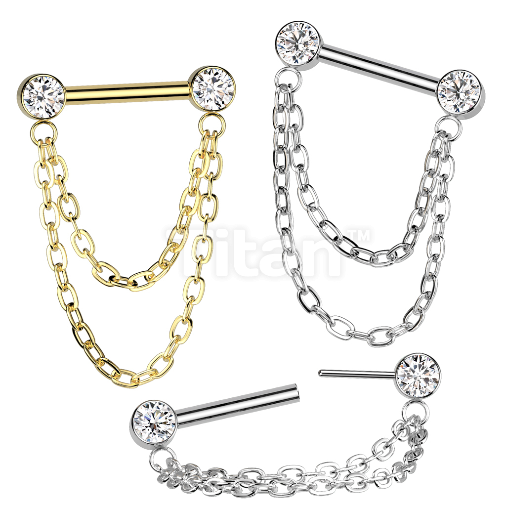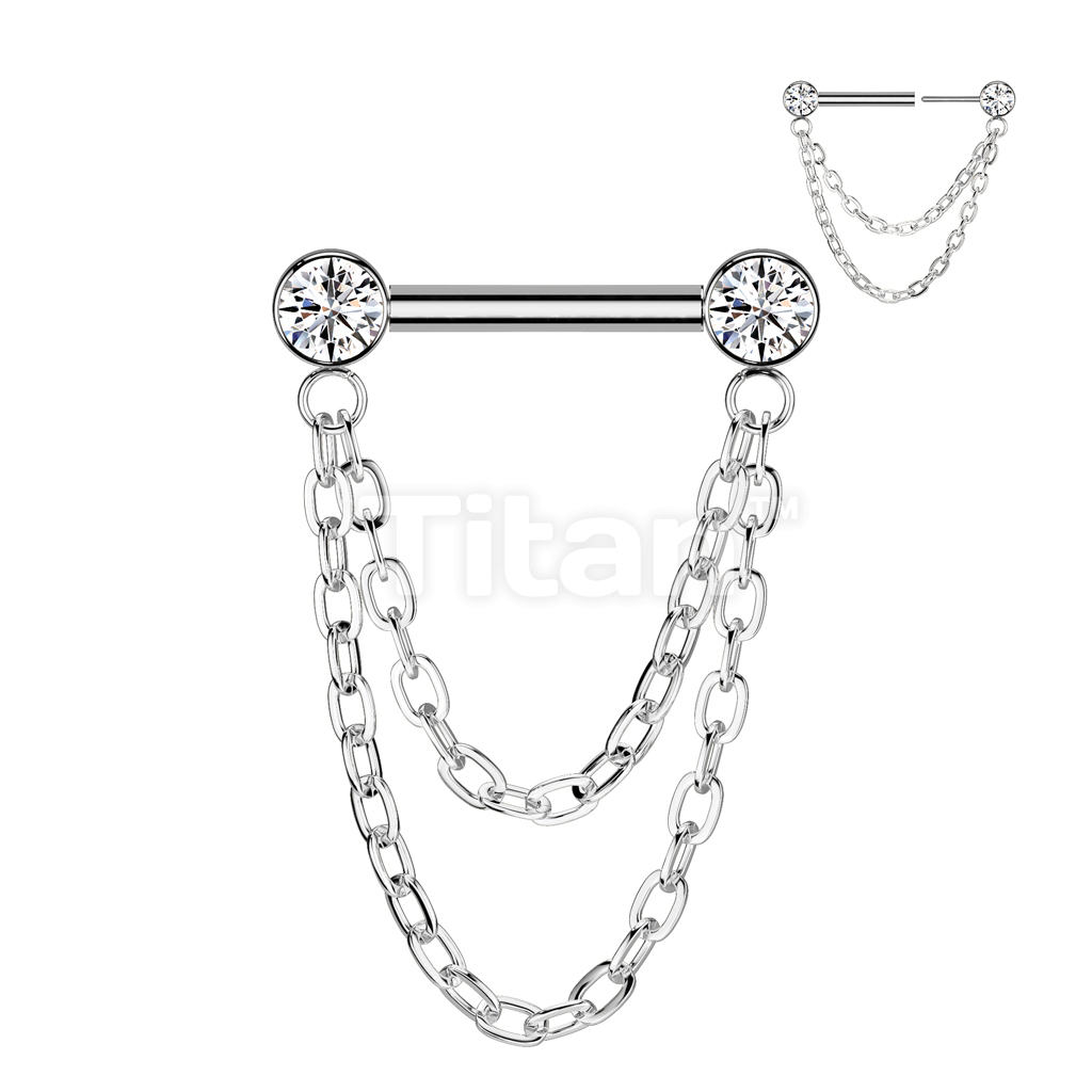 Implant Grade Titanium Threadless Push In Barbell With Forward Facing Bezel Set CZ Ends and Double Chain Dangle