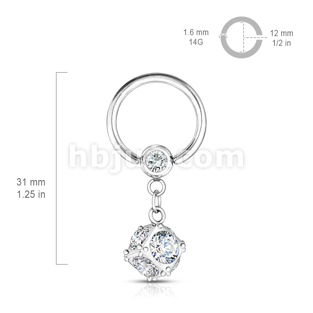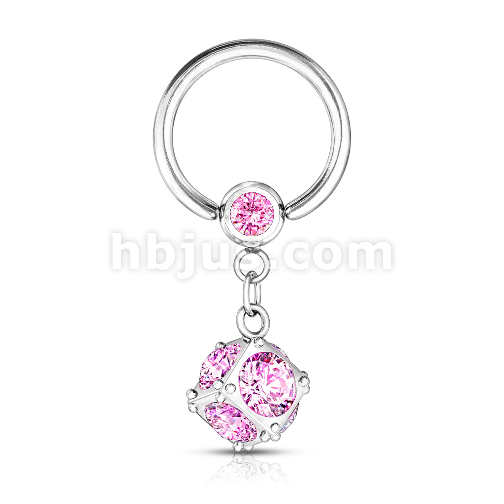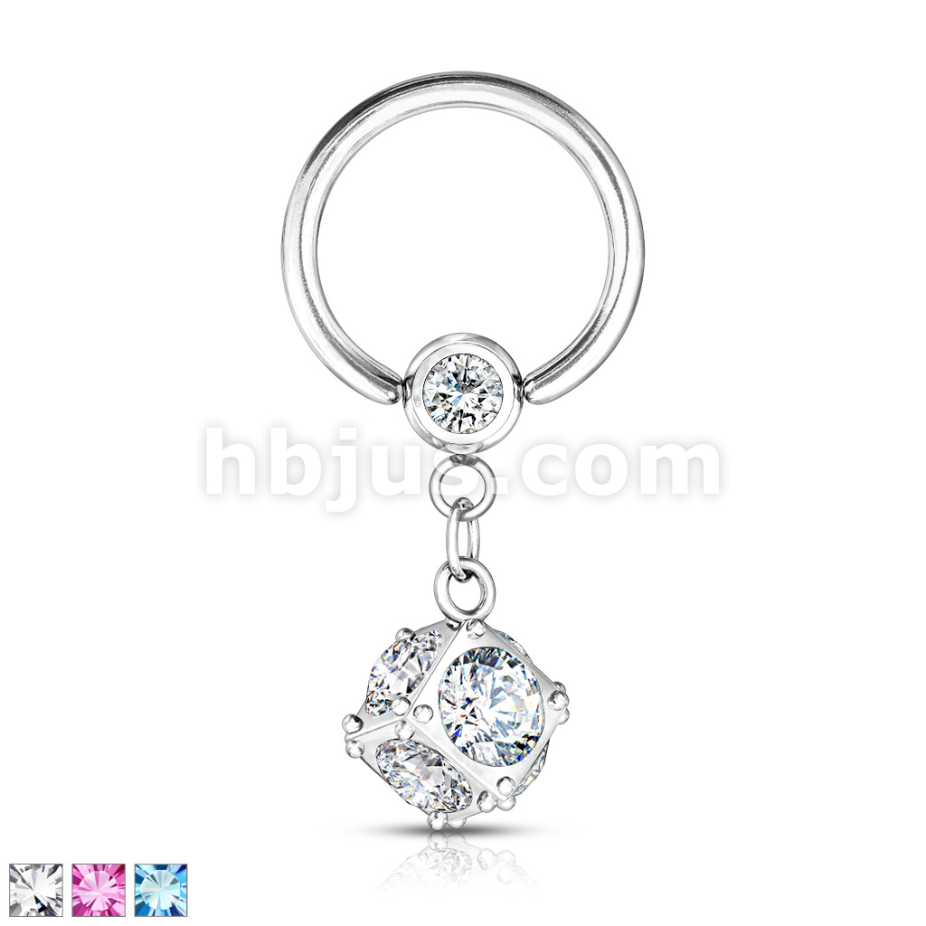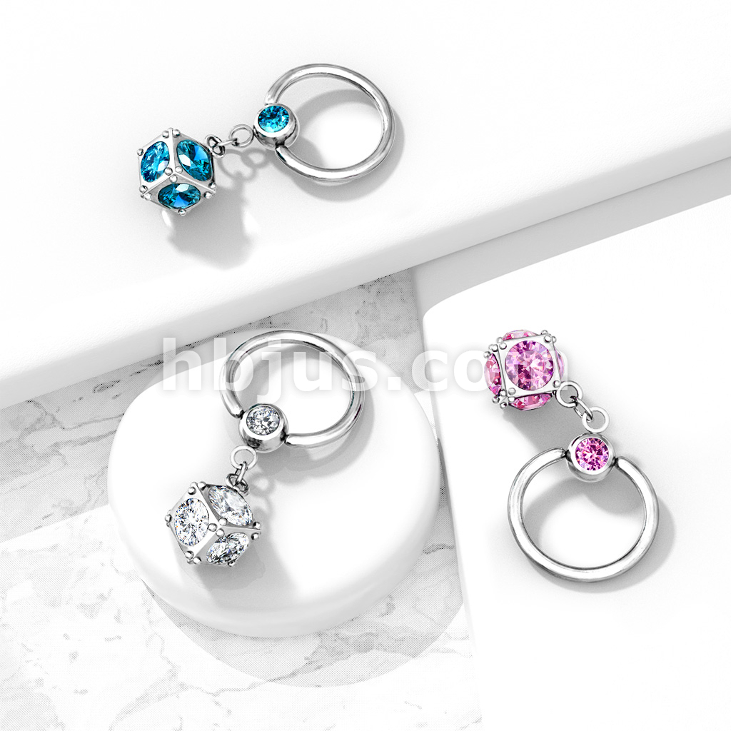 Dice Multi Gem Paved Dangle 316L Surgical Steel Gemmed Captive Bead Ring