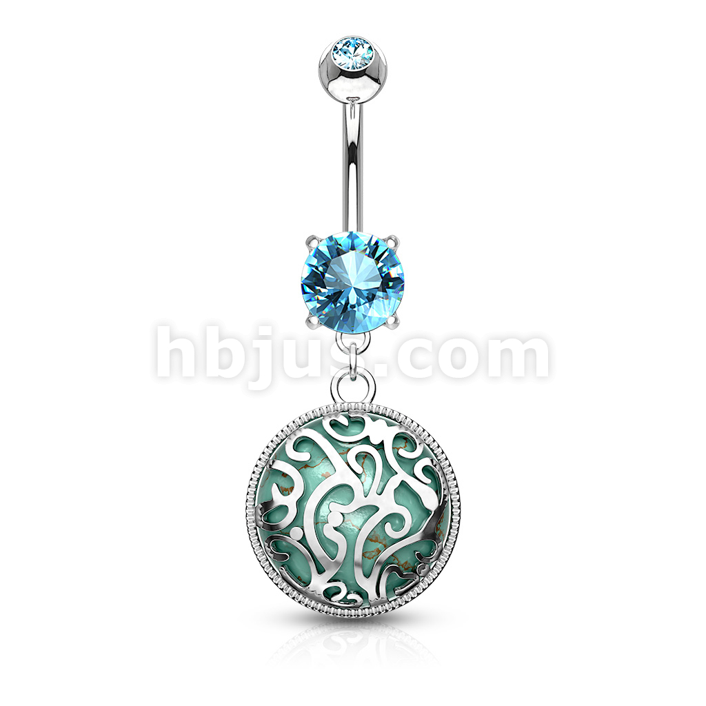 316L Surgical Steel Swirls Medalian With Turquoise Semi Precious Stone Inside Belly Button Ring