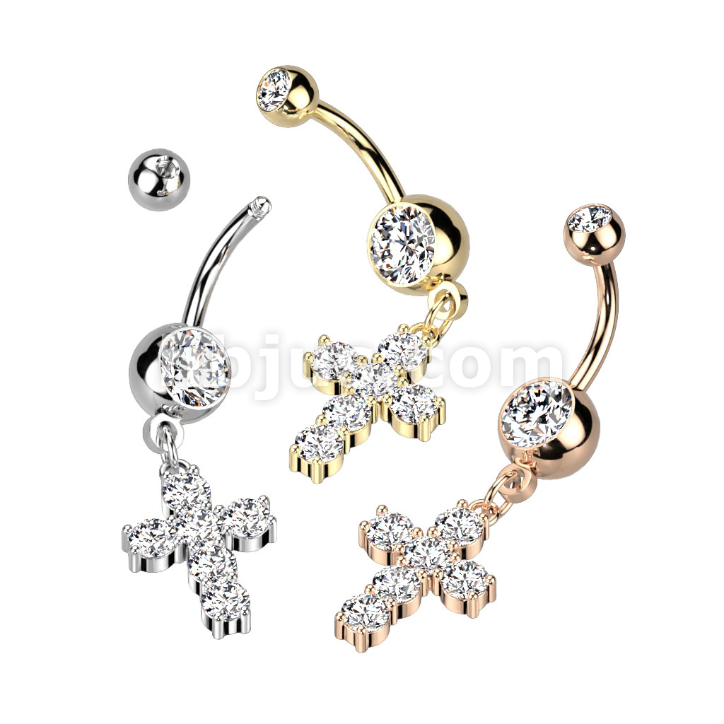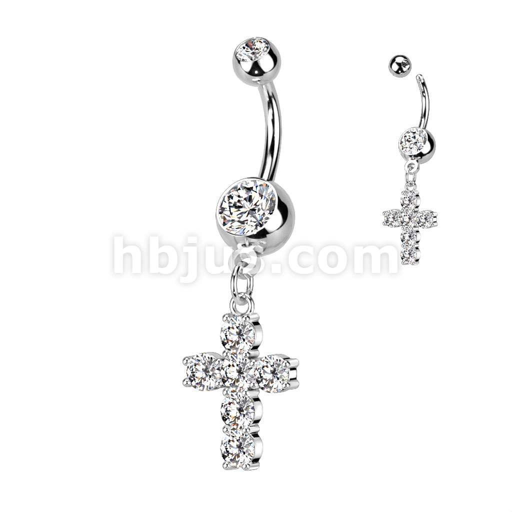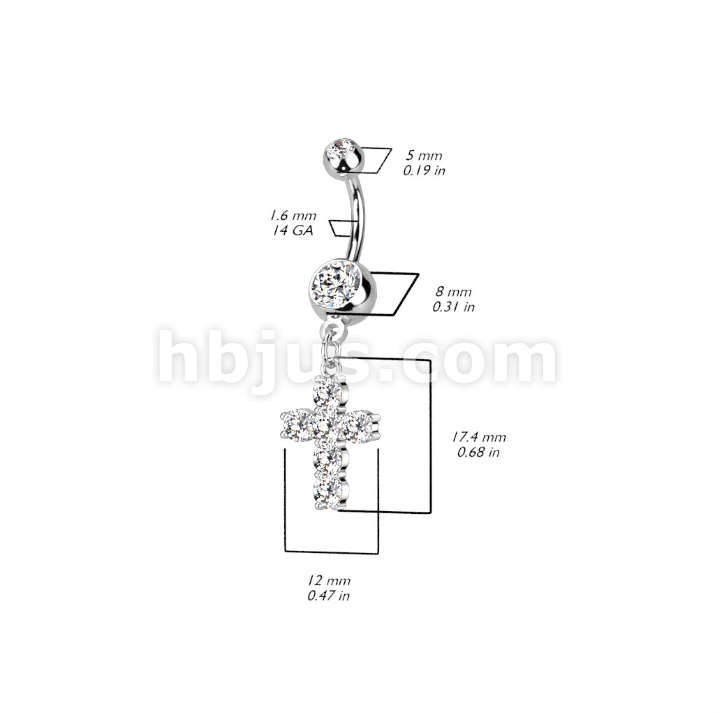 316L Surgical Steel Cross Dangle Double Jeweled Belly Button Ring