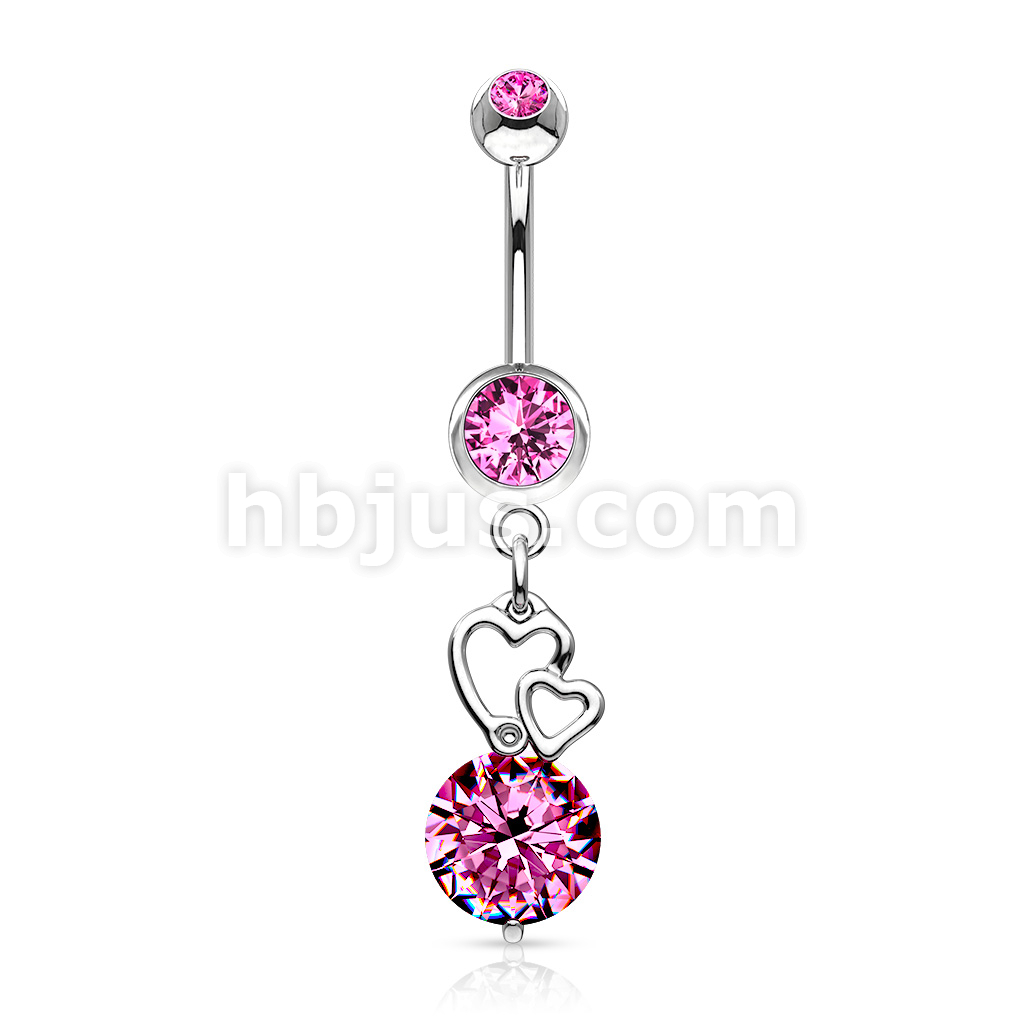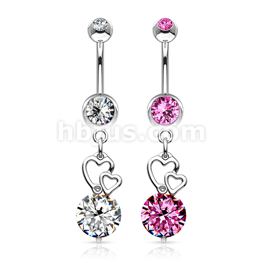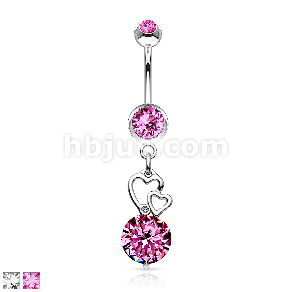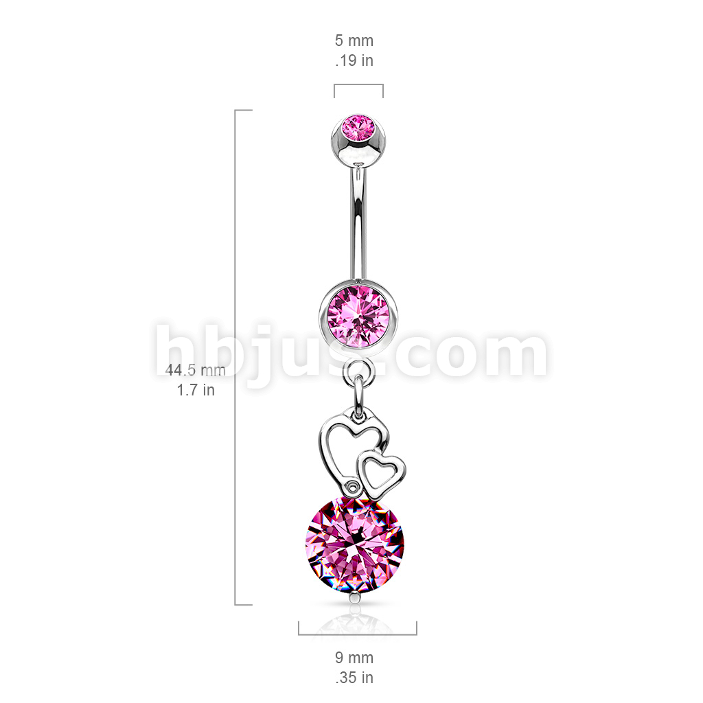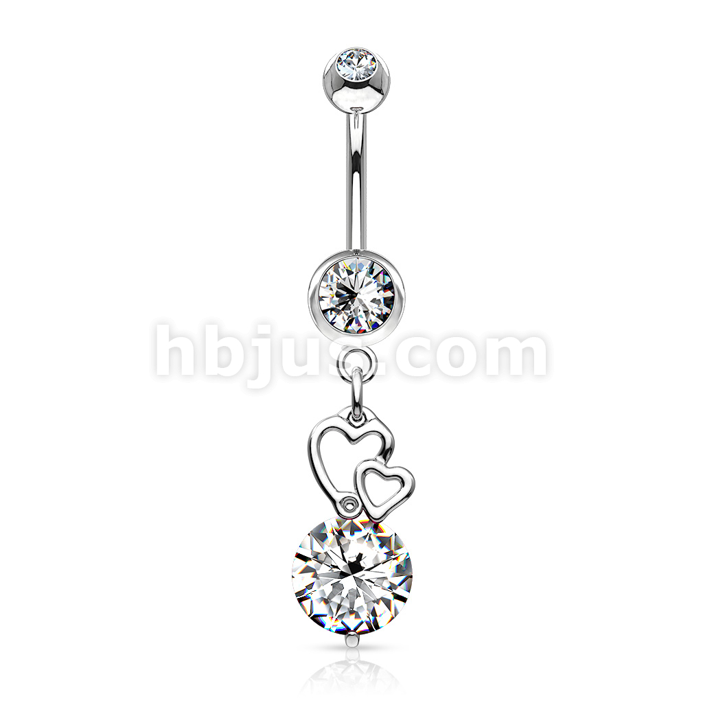 316L Surgical Steel Extra Large CZ With Floating Hearts Belly Button Ring