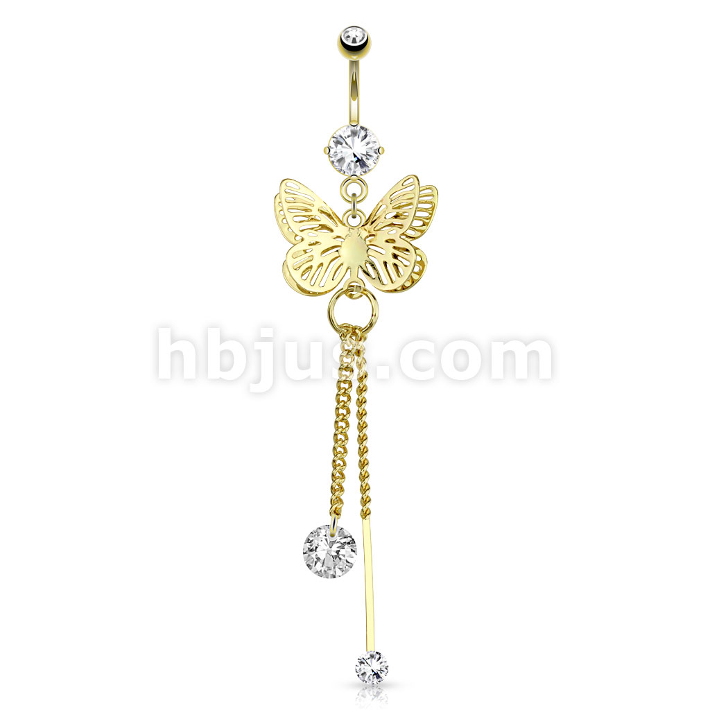 316L Surgical Steel Butterfly Wings Overlapped and CZ Attached to Chain Dangle Belly Button Ring