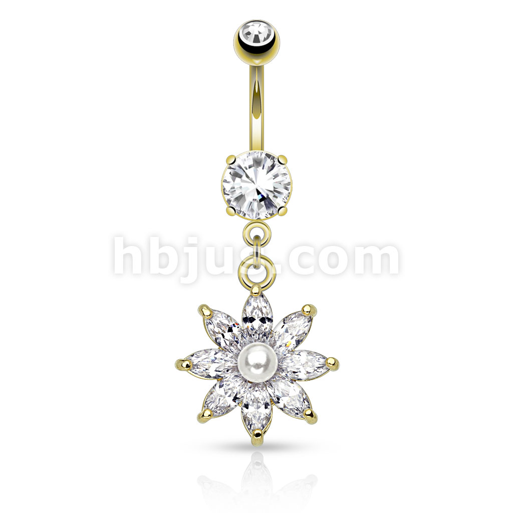 316L Surgical Steel Pearl With Marquise CZ Flower Petals Dangle Belly Button Ring