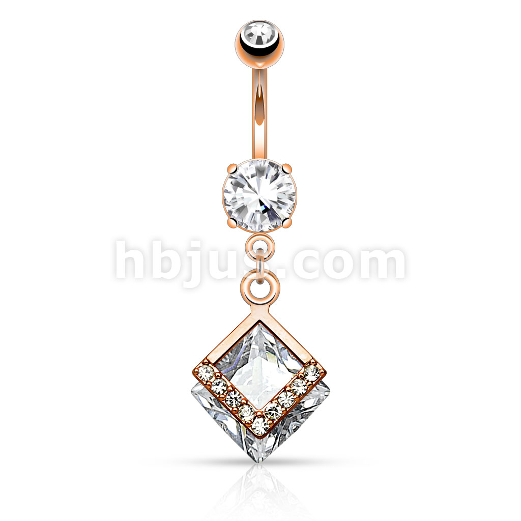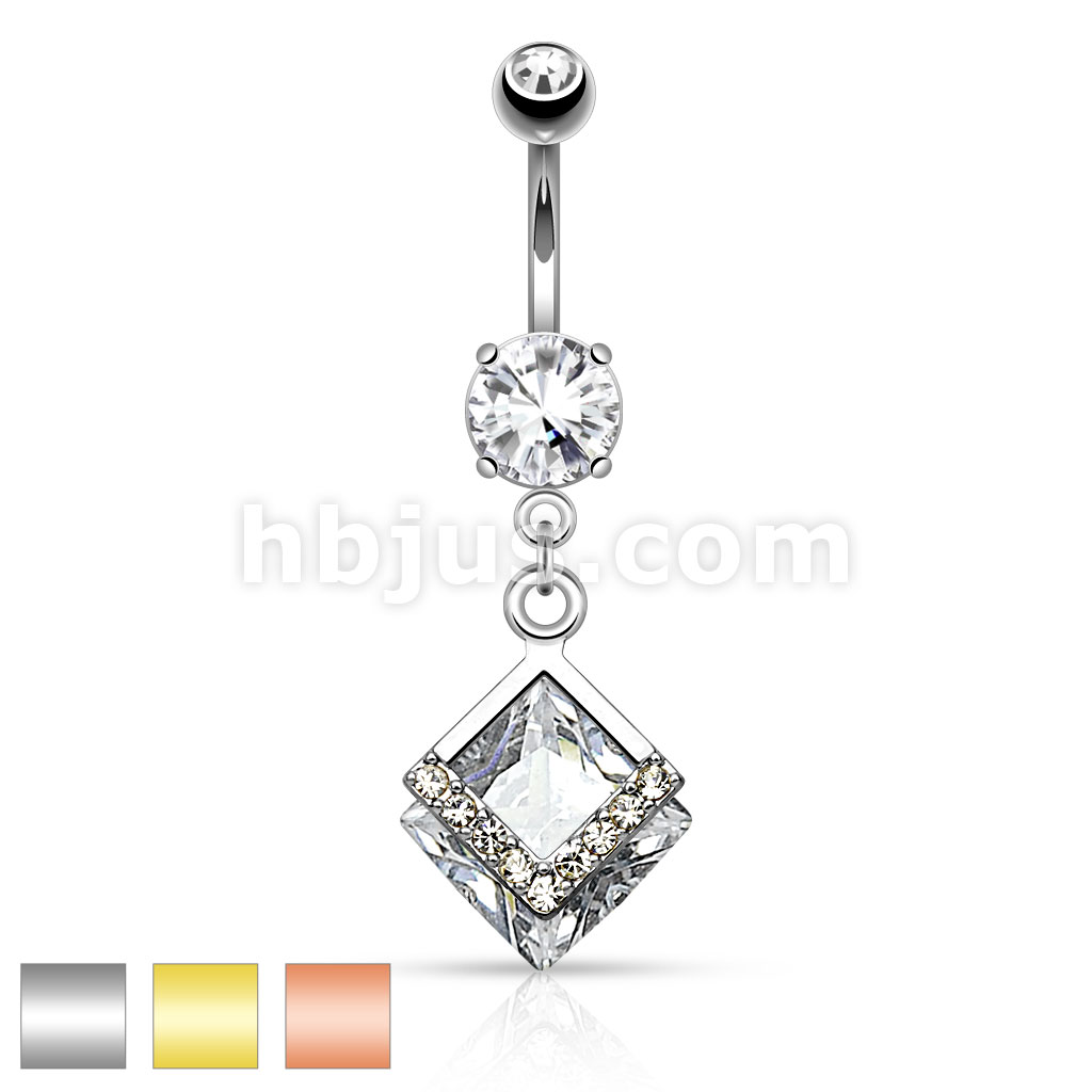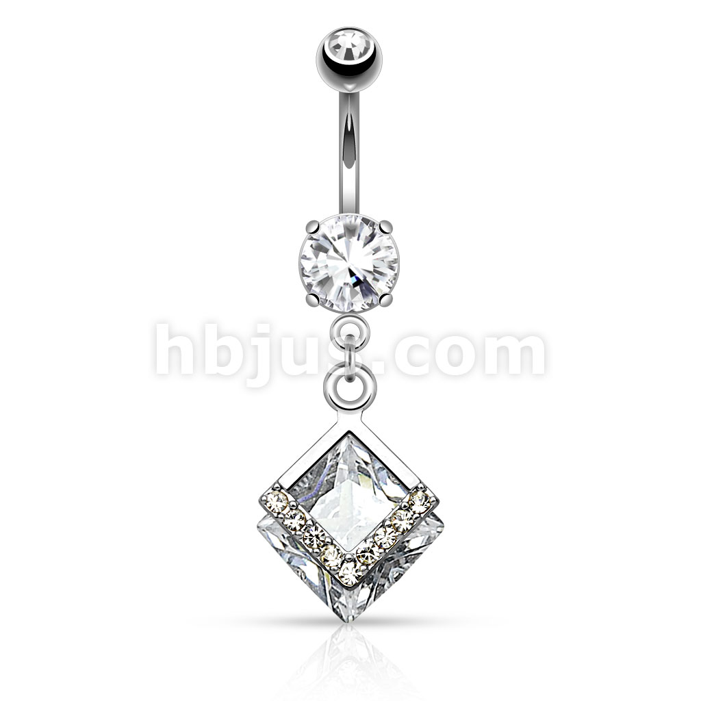 316L Surgical Steel Mounted Diamond Shaped CZ With Paved CZs Dangle Belly Button Ring