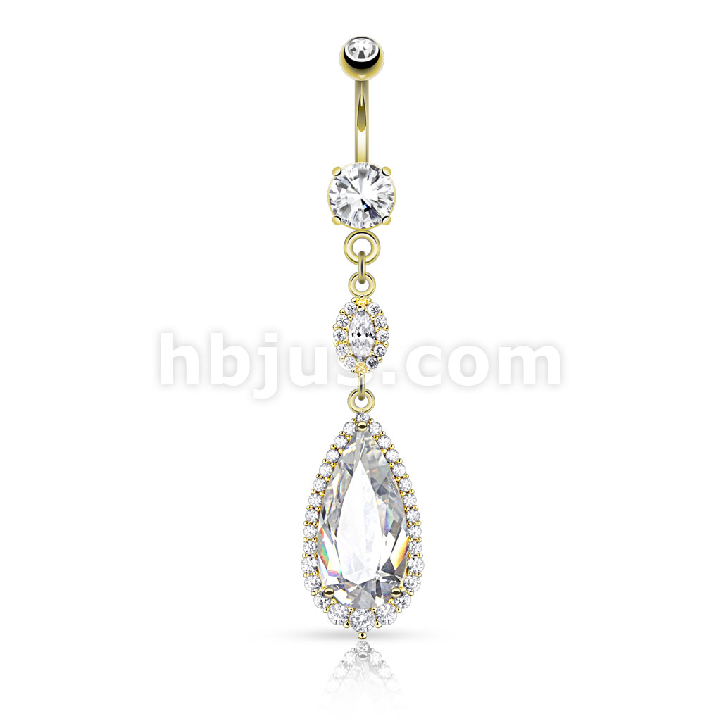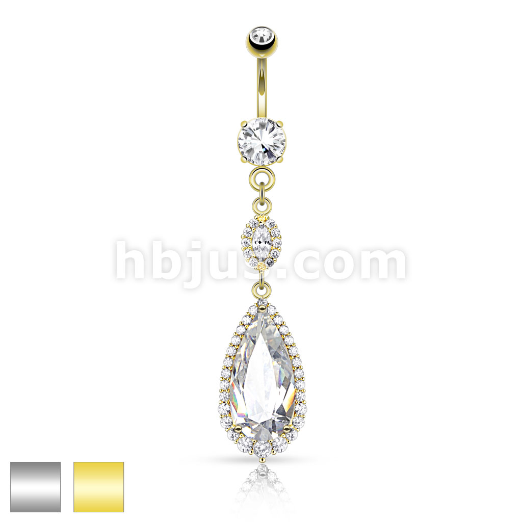 316L Surgical Steel Large Teardrop CZ With Paved Trim Chandelier Dangle Belly Button Ring