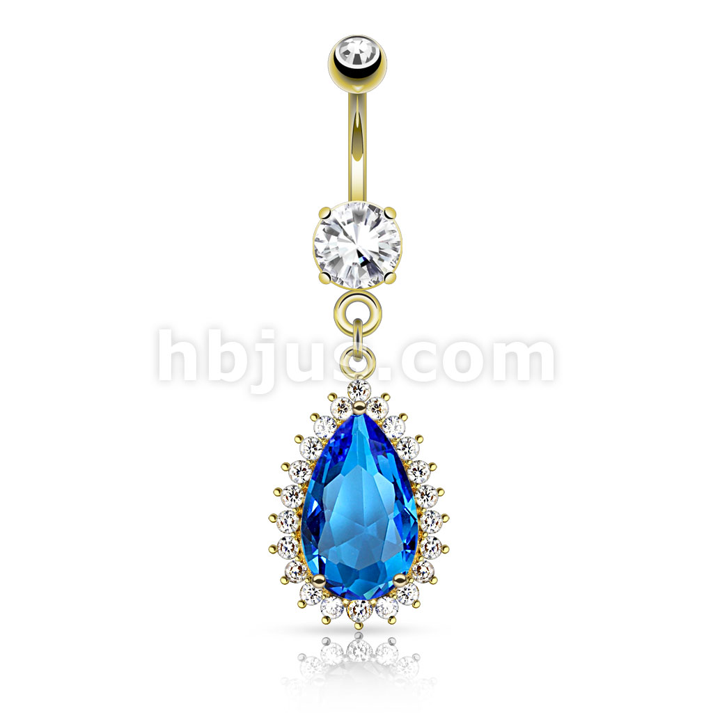 316L Surgical Steel Large Blue Tear Drop CZ and Clear CZ Trim Dangle Belly Button Ring