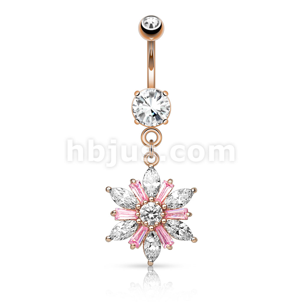 316L Surgical Steel Marquise Cut CZ Petals With Princess Cut Pink CZ Center Flower Dangle Belly Button Ring