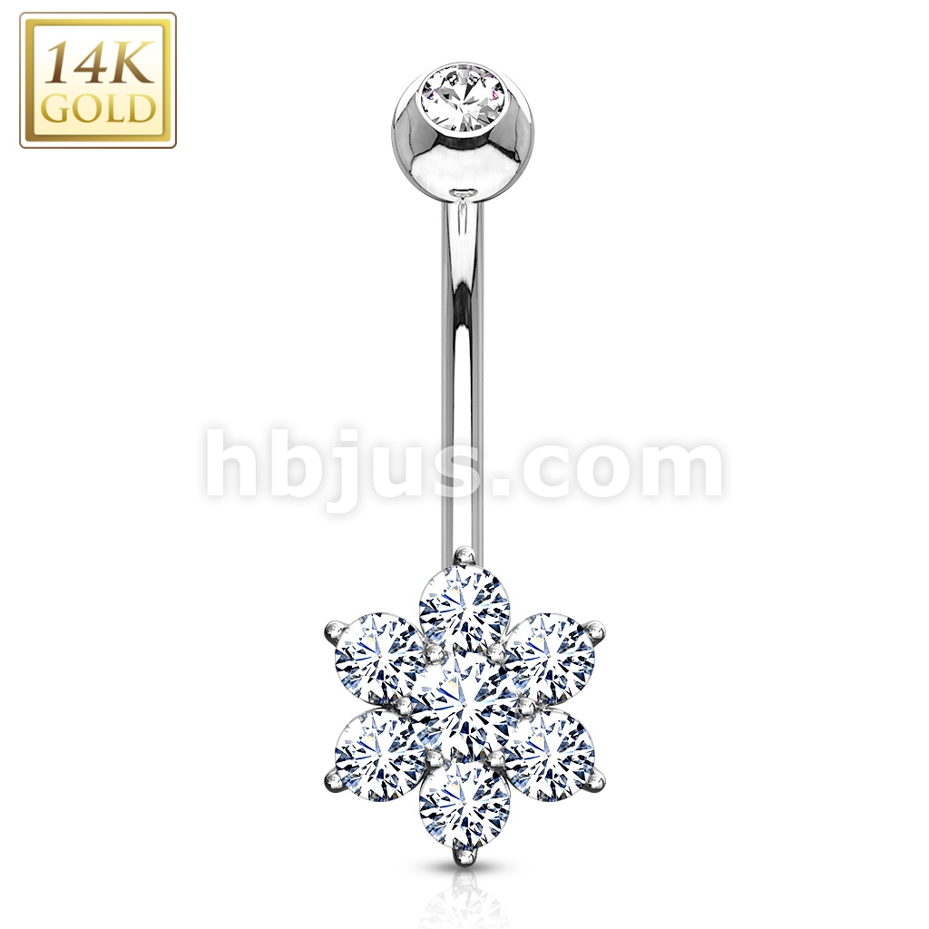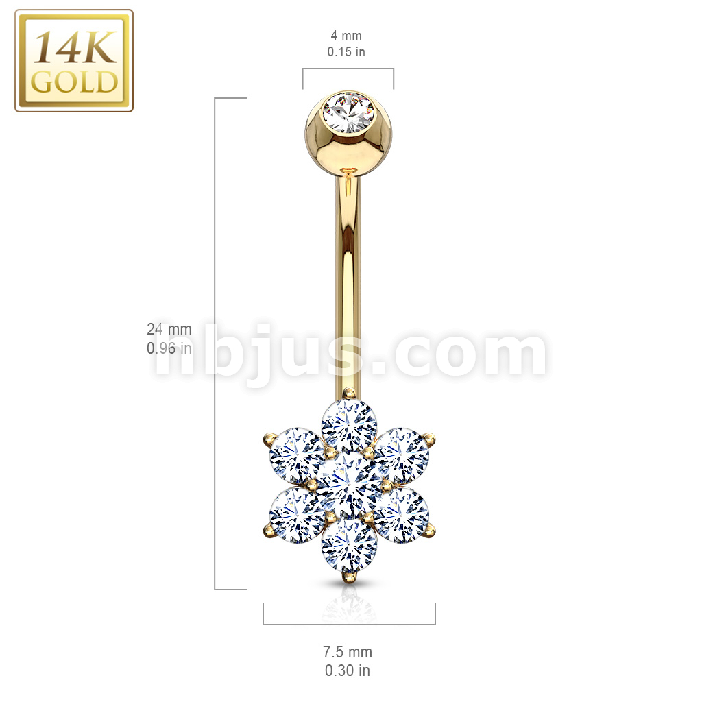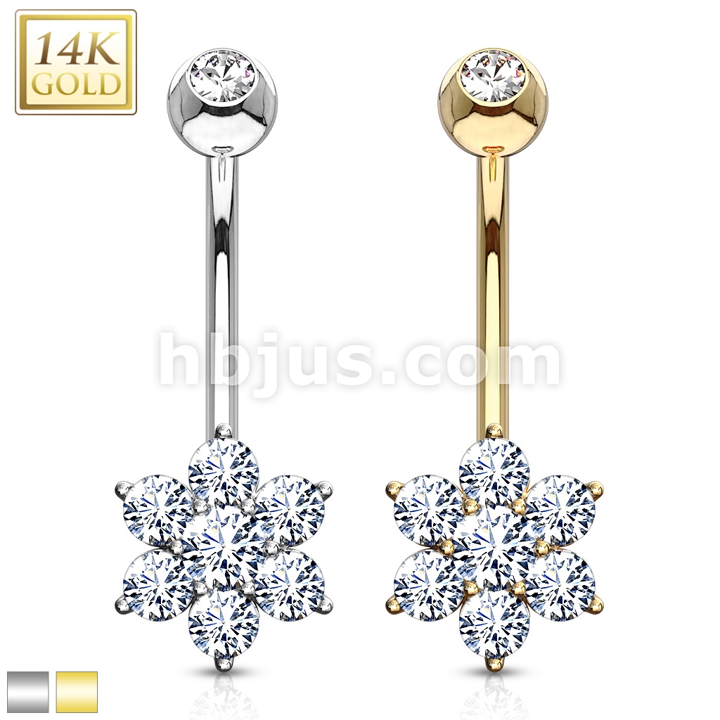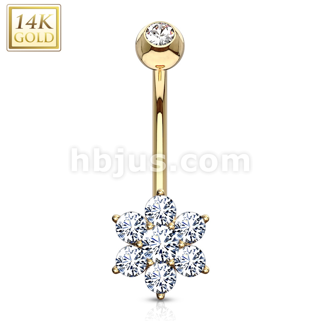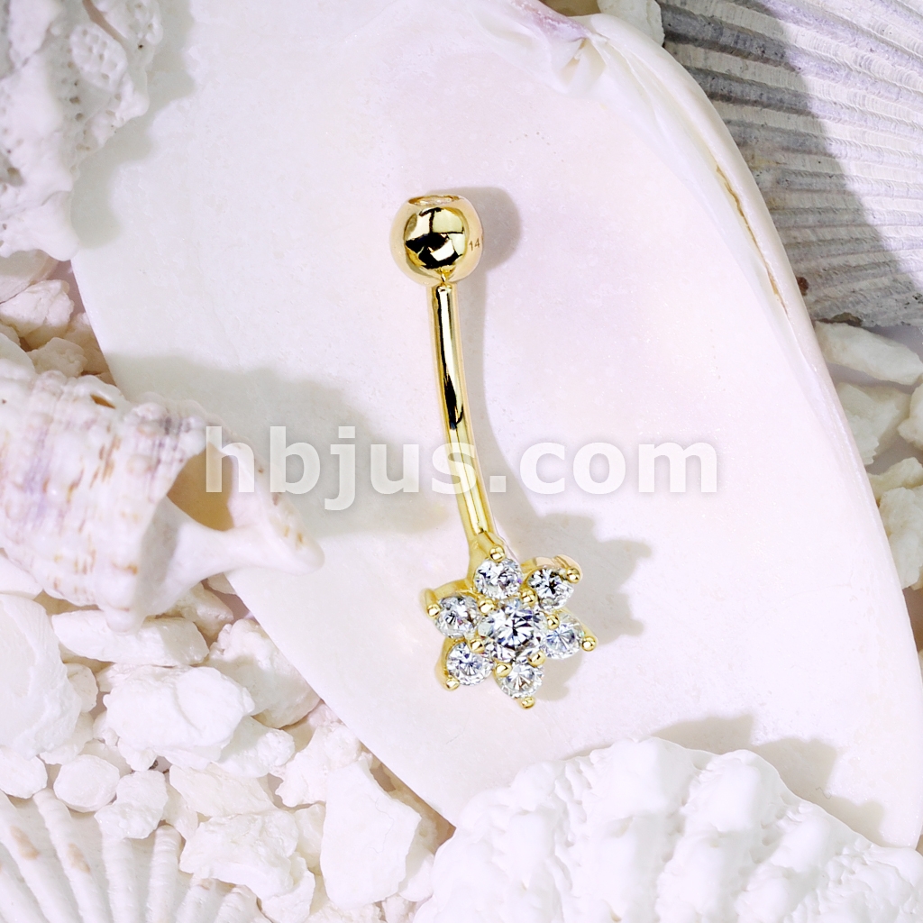 14K Gold Flower Clear CZ Navel Belly Button Ring