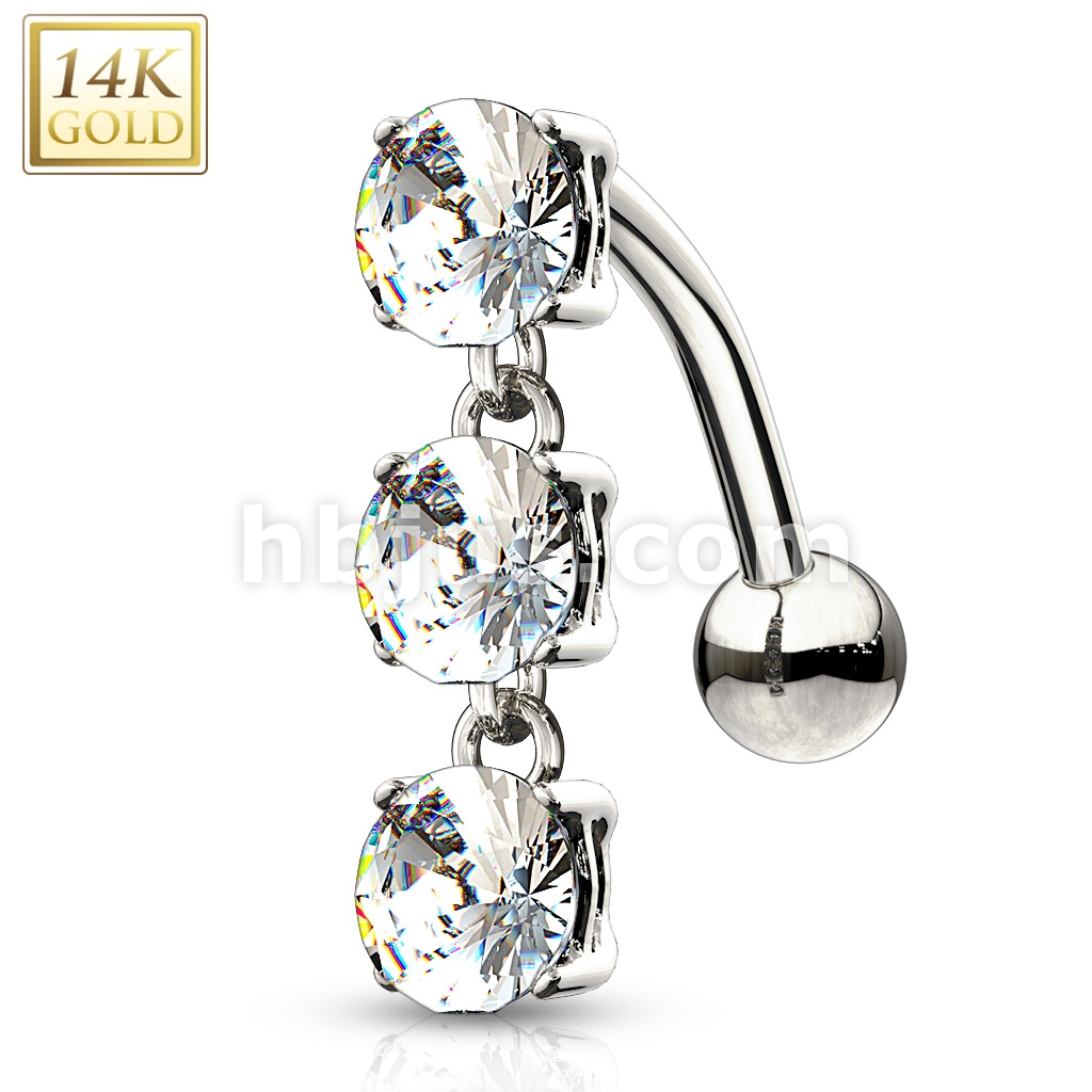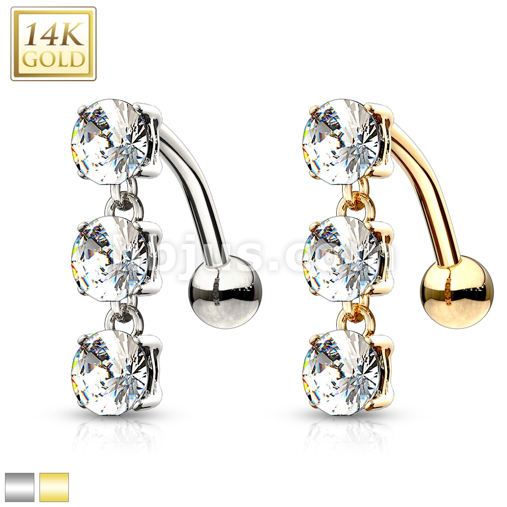 14K Gold Top Down Triple CZ Stones Dangle Navel Ring