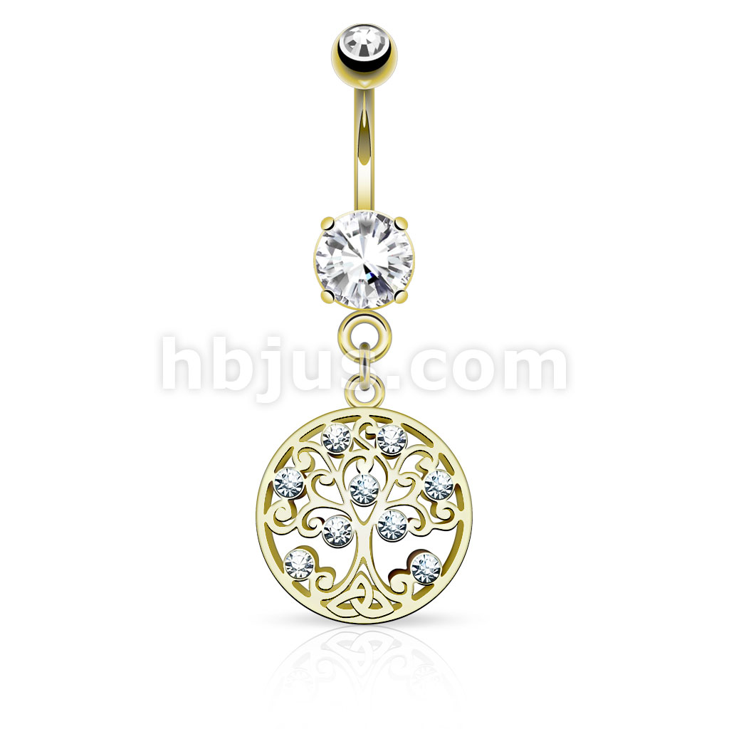 316L Surgical Steel CZ Set Tree of Life Dangle on Round CZ Prong Set Belly Button Ring