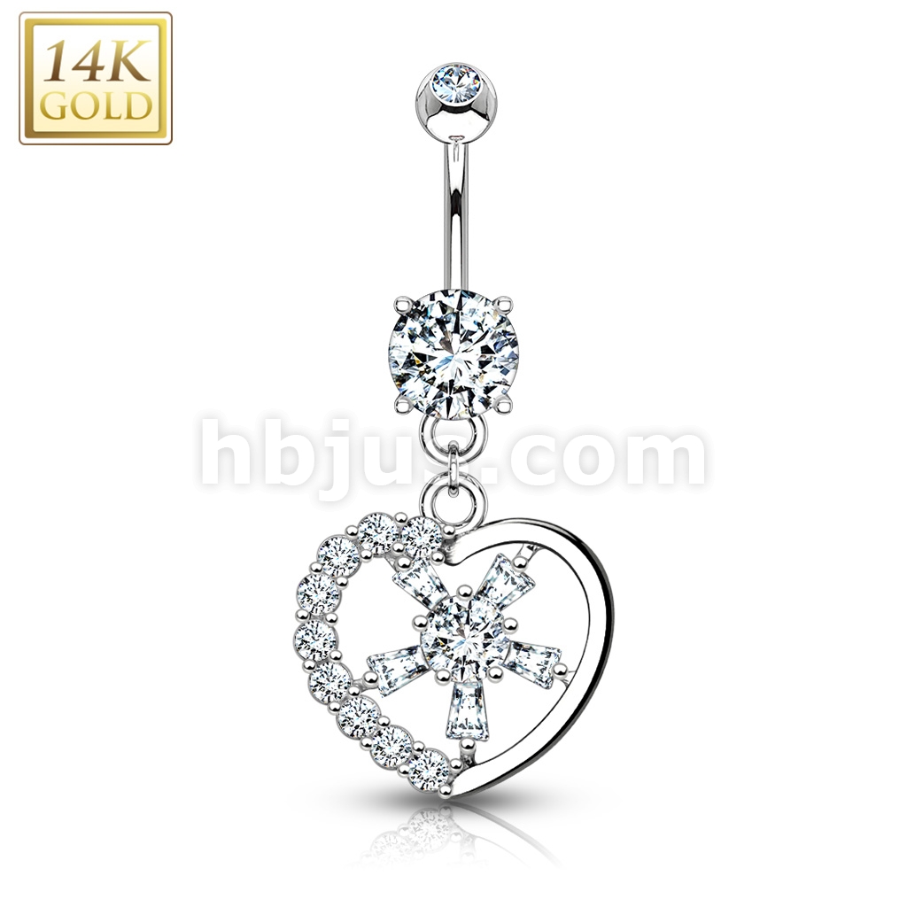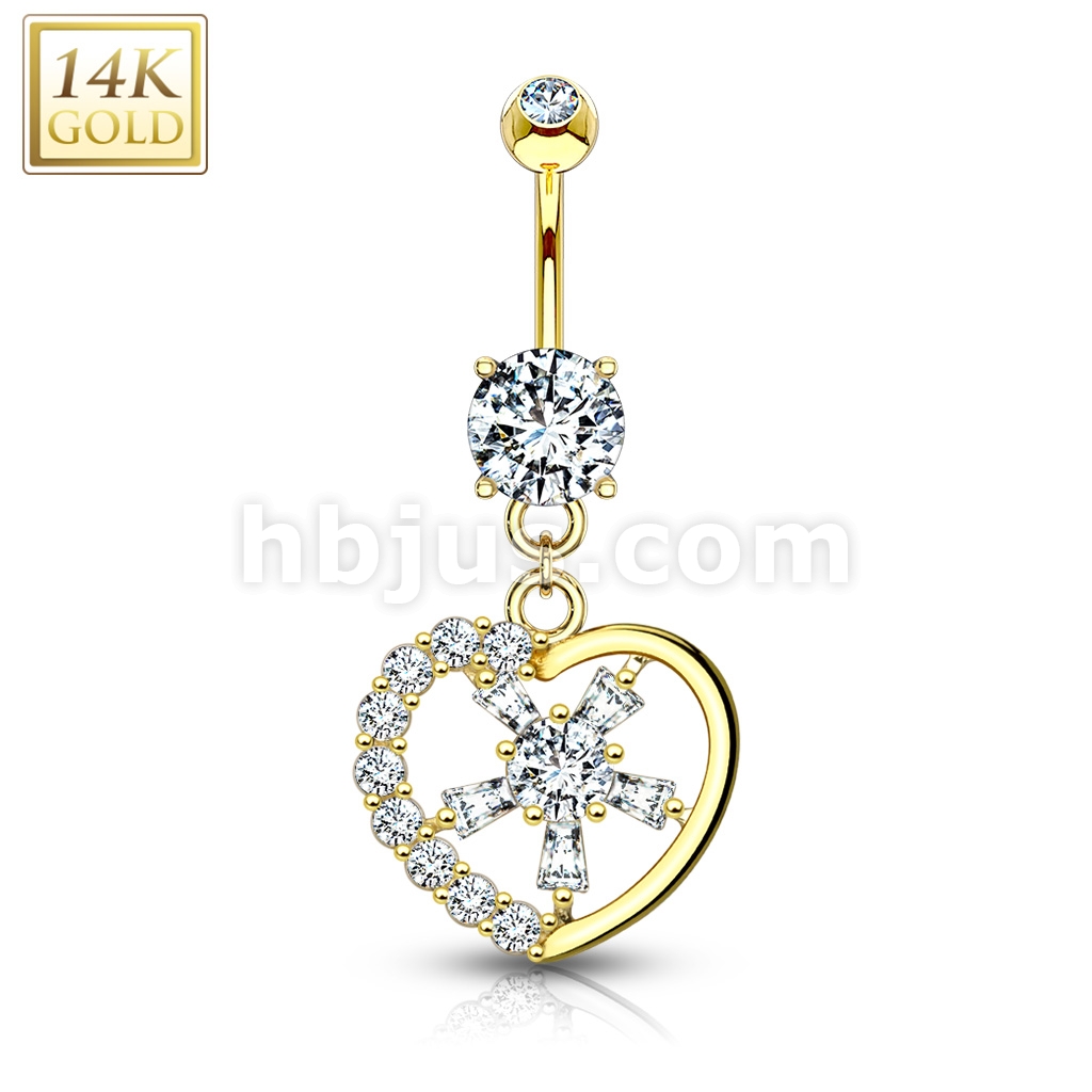 Gemmed Heart with CZ Spoke Center 14KT Gold Dangle Navel Ring