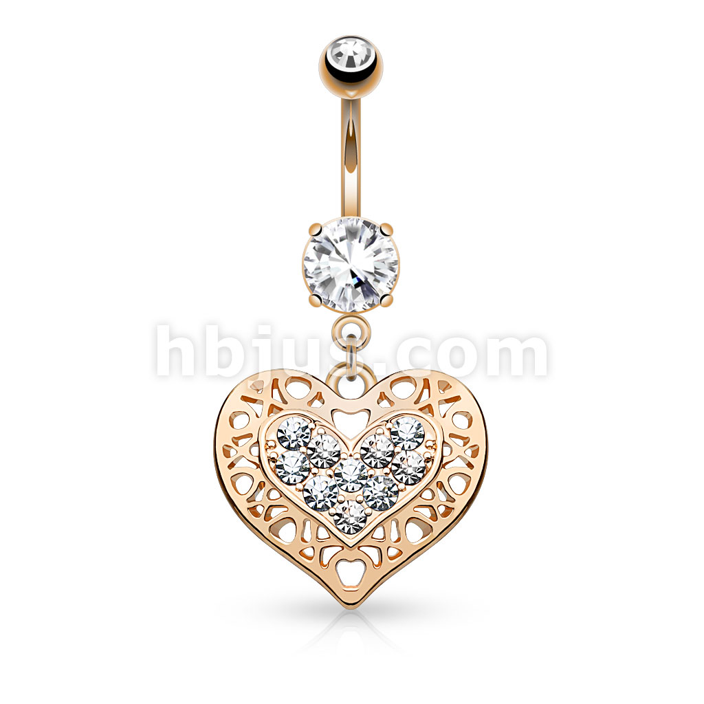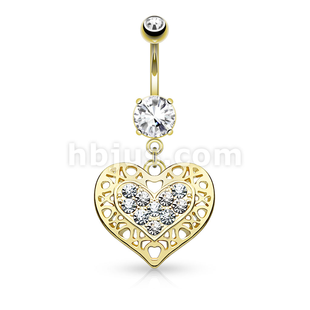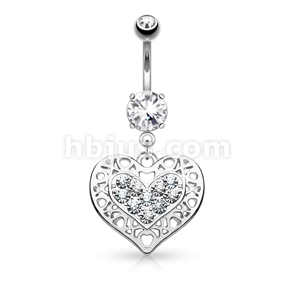 316L Surgical Steel Tribal Heart Filigree Edged Crystal Paved Heart Dangle Belly Button Ring