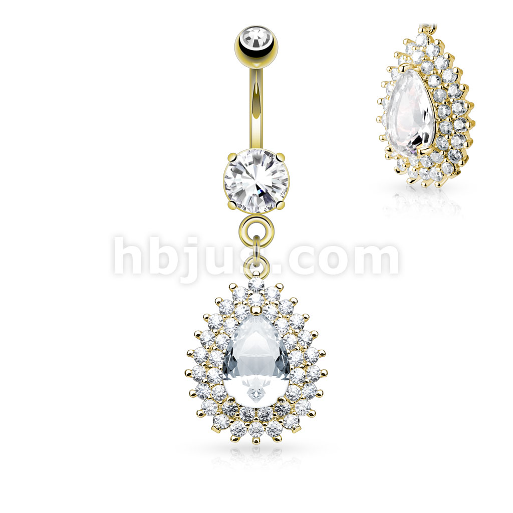 316L Surgical Steel Double Tier Paved CZ and Large CZ Centered Tear Drop Dangle Belly Button Ring