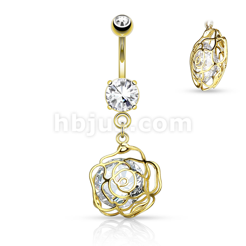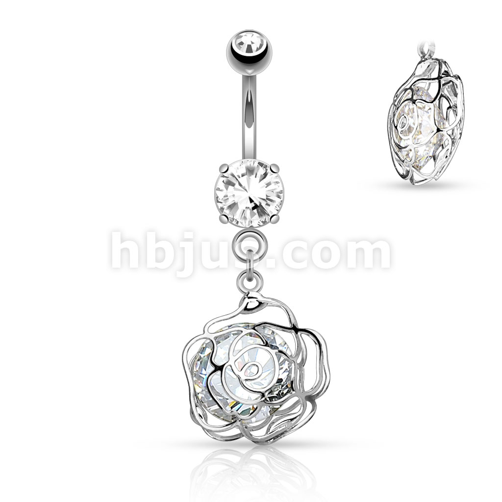 316L Surgical Steel Large CZ Incased Camellia Flower Dangle Belly Button Ring