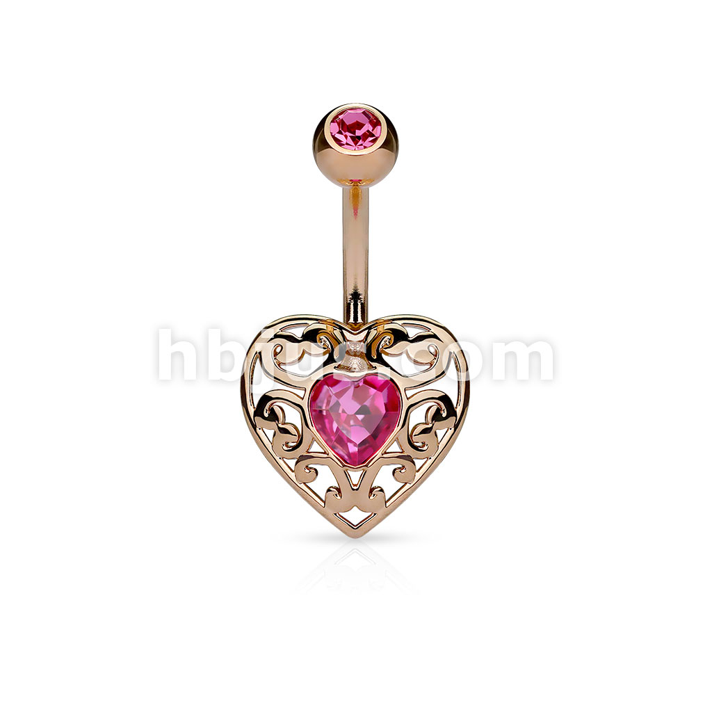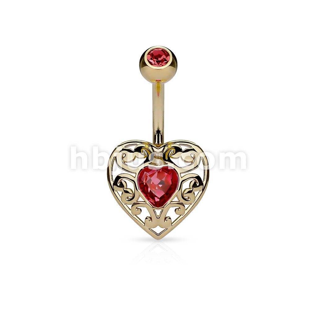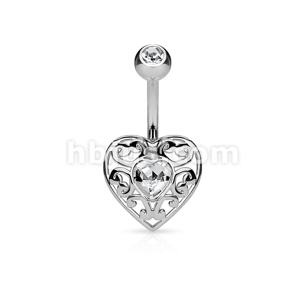 316L Surgical Steel Vintage Filigree Heart With Heart Crystal Center Belly Button Ring
