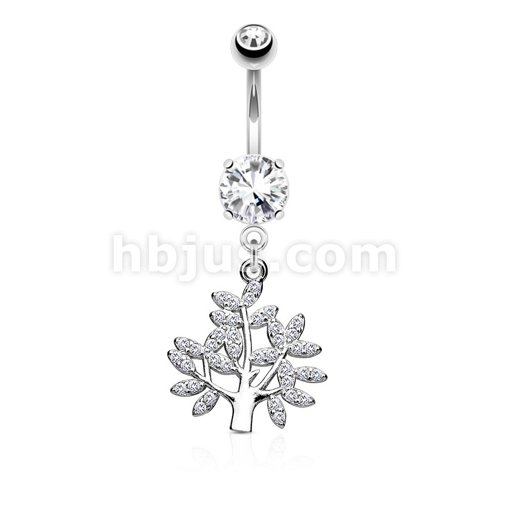 316L Surgical Steel Micro CZ Paved Life Tree Dangle and Round CZ Set Belly Button Ring