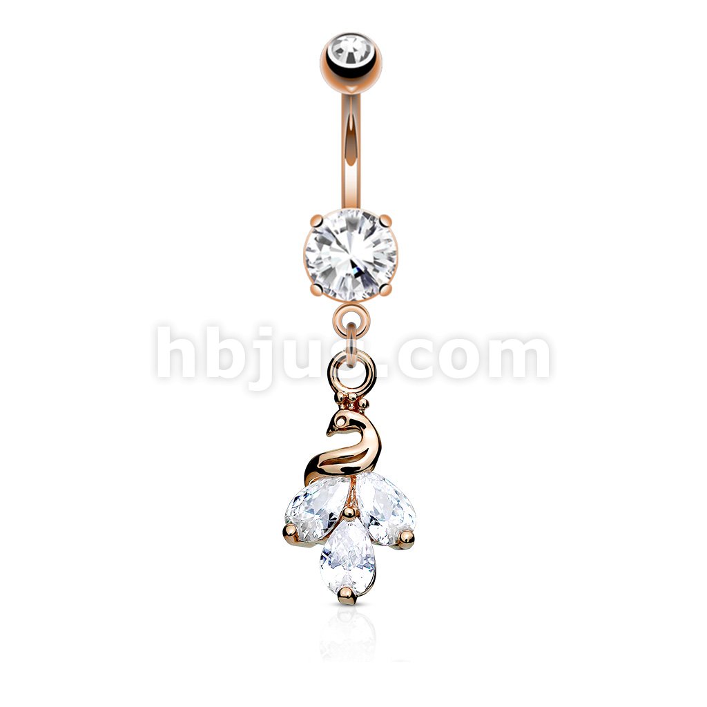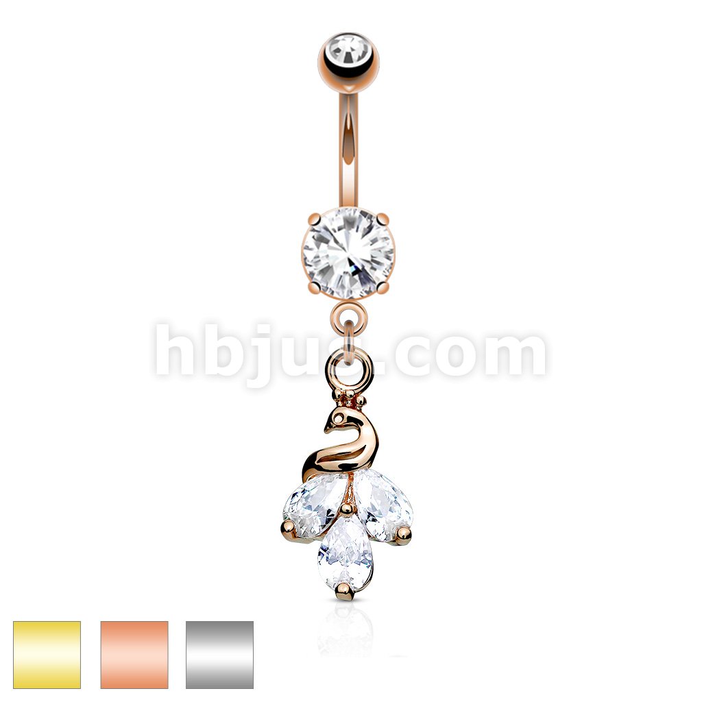 316L Surgical Steel Cluster CZ Peacock Dangle and Round CZ Prong Set Belly Button Ring