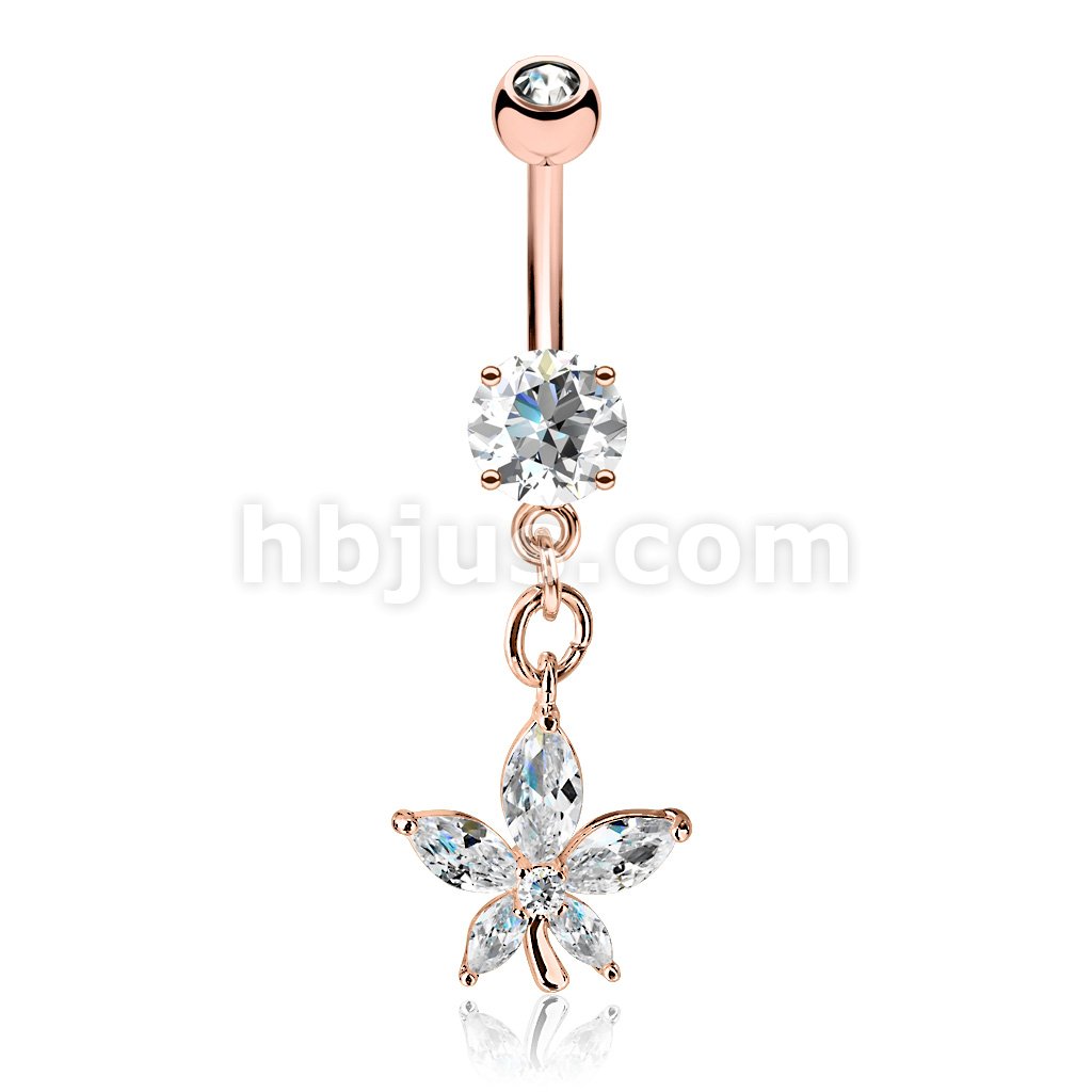 316L Surgical Steel Marquise CZ Petal Flower Dangle Round CZ Belly Button Ring