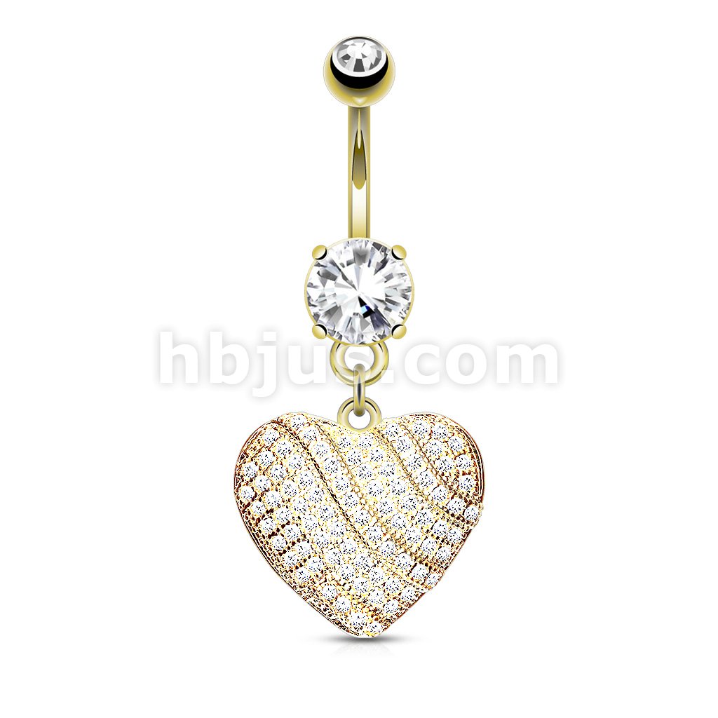316L Surgical Steel Micro CZ Paved Heart Dangle Round CZ Prong Set Belly Button Ring