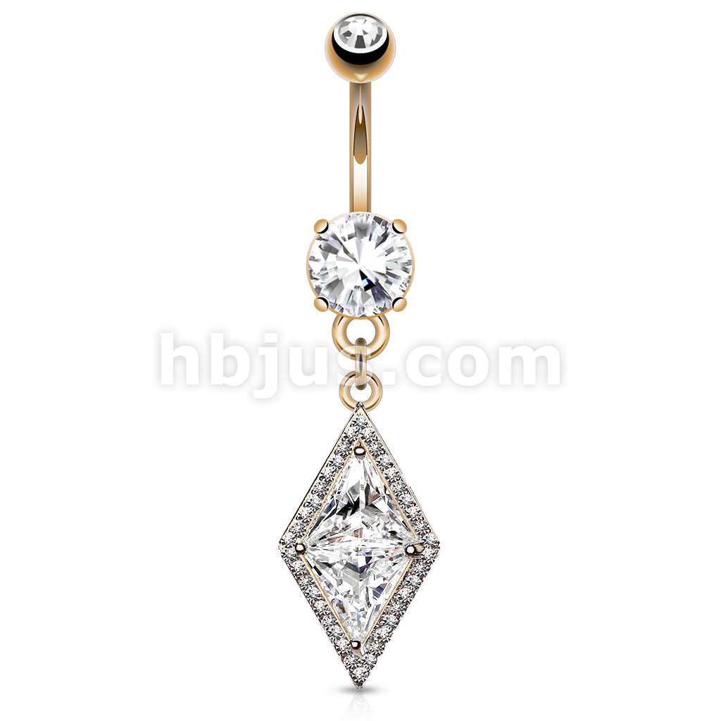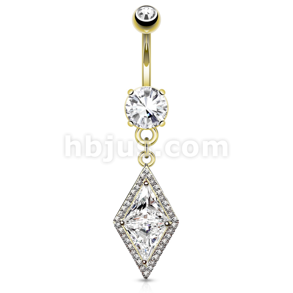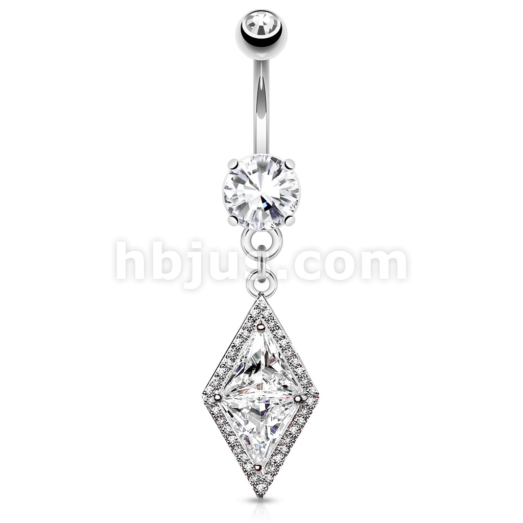 316L Surgical Steel Double Tier Belly Ring With Large Diamond CZ Center and Pave CZ Edge Dangle