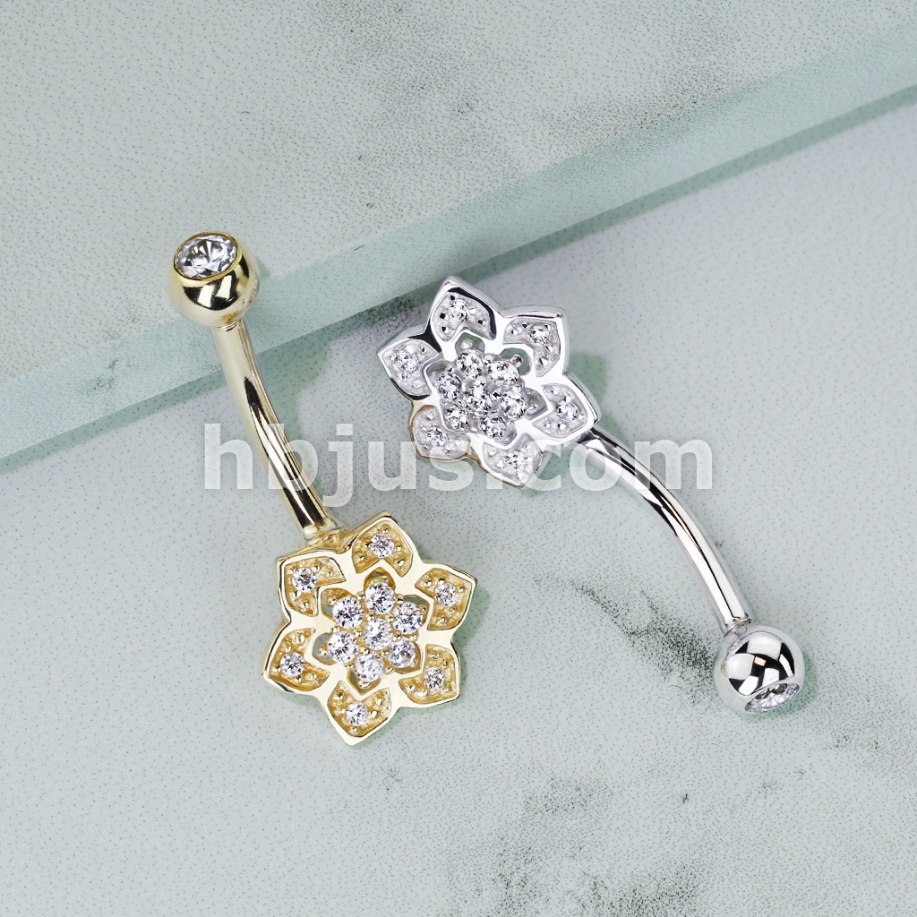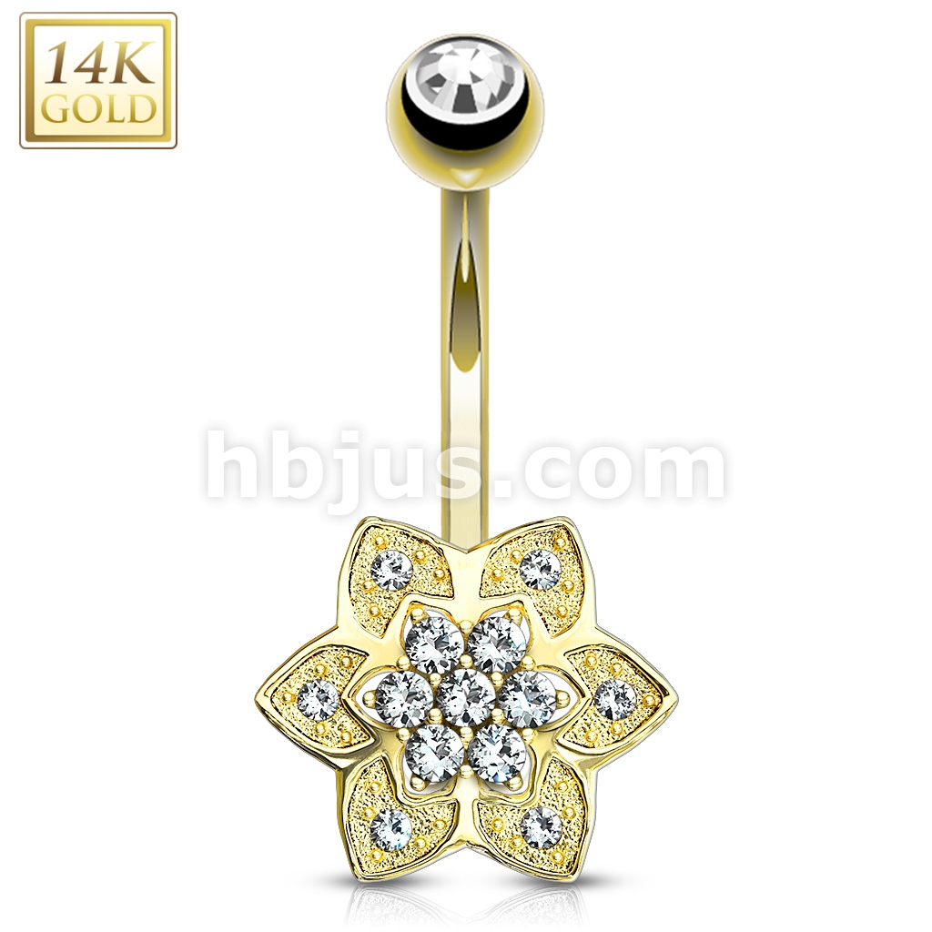 Gem Paved 6 Petals CZ Cluster Center 14 Karat Solid Gold Navel Ring