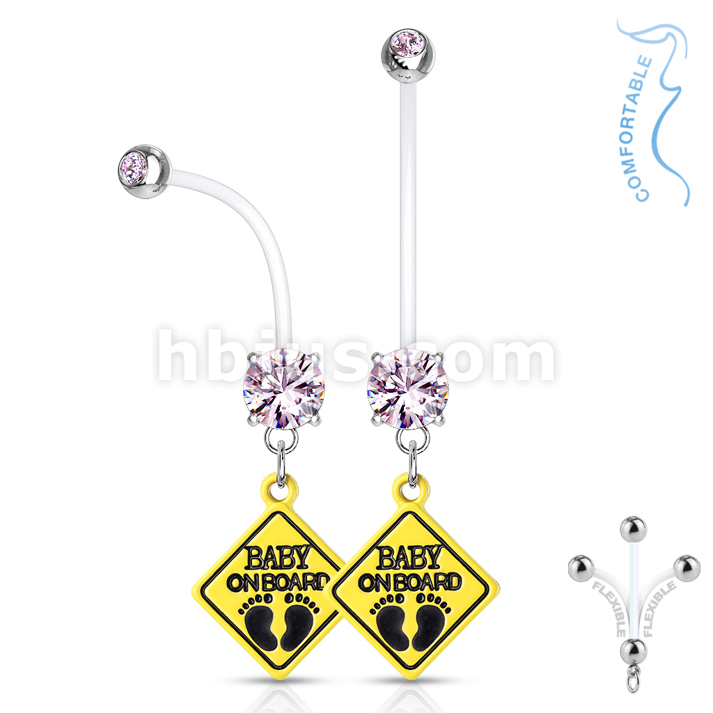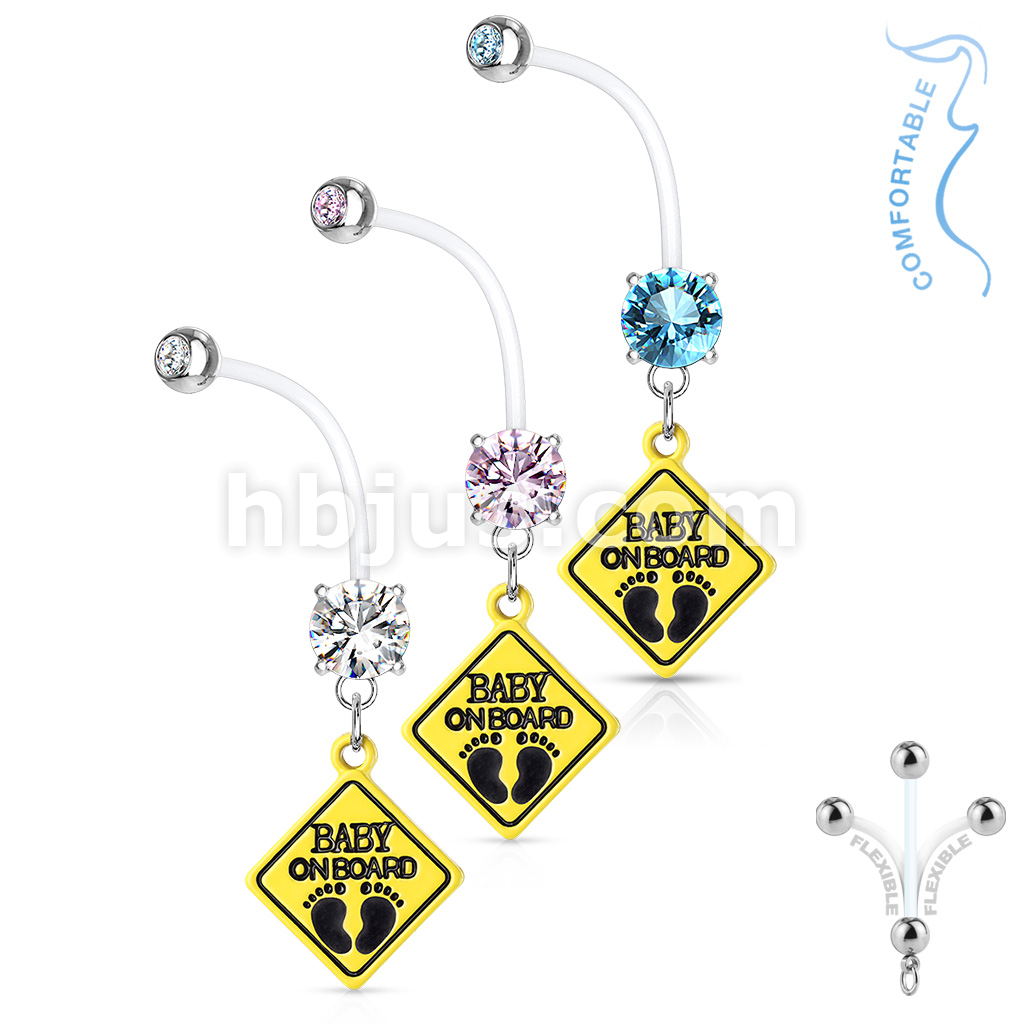 Double Jeweled Prong Set Round CZ with Baby on Board Sign Dangle Pregnancy Belly Rings Bioflex with 316L Surgical Steel Balls