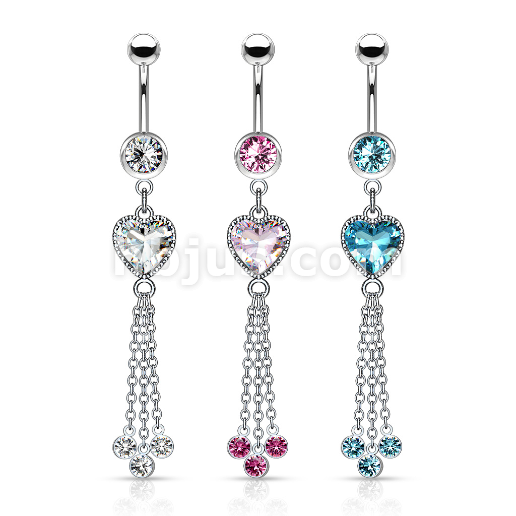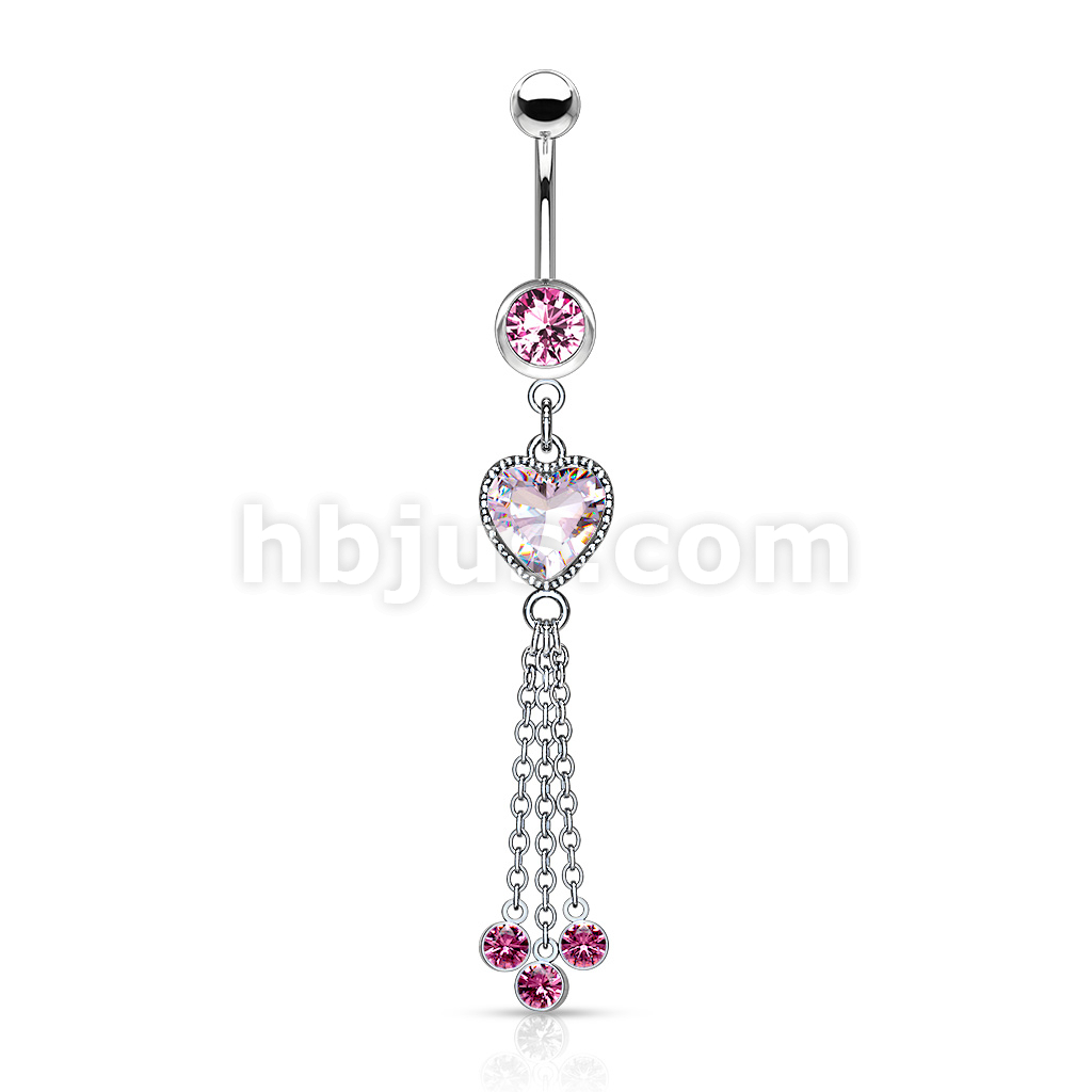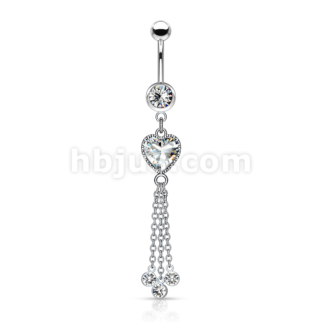 316L Surgical Steel Heart CZ and Chains With CZ Dangle Belly Button Ring