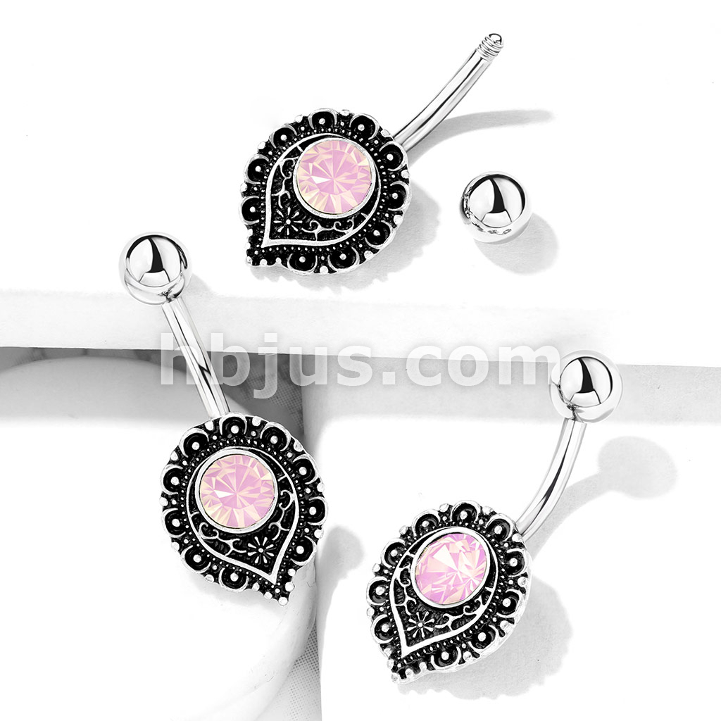 Pink Opalite Crystal Center Heart Filigree 316L Surgical Steel Belly Button Navel Rings
