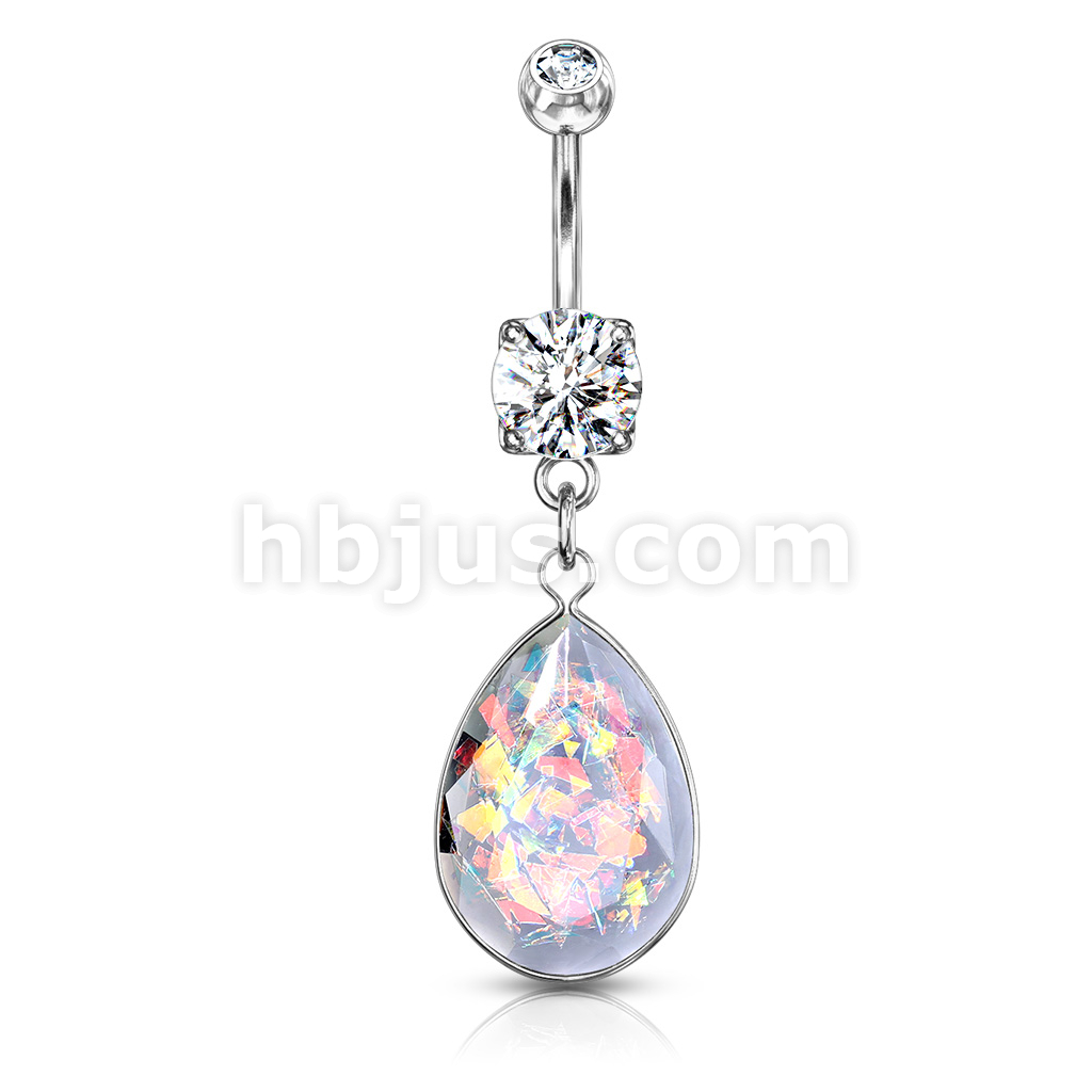 316L Surgical Steel Rainbow Glitter Opalite Stone Dangle Belly Button Ring