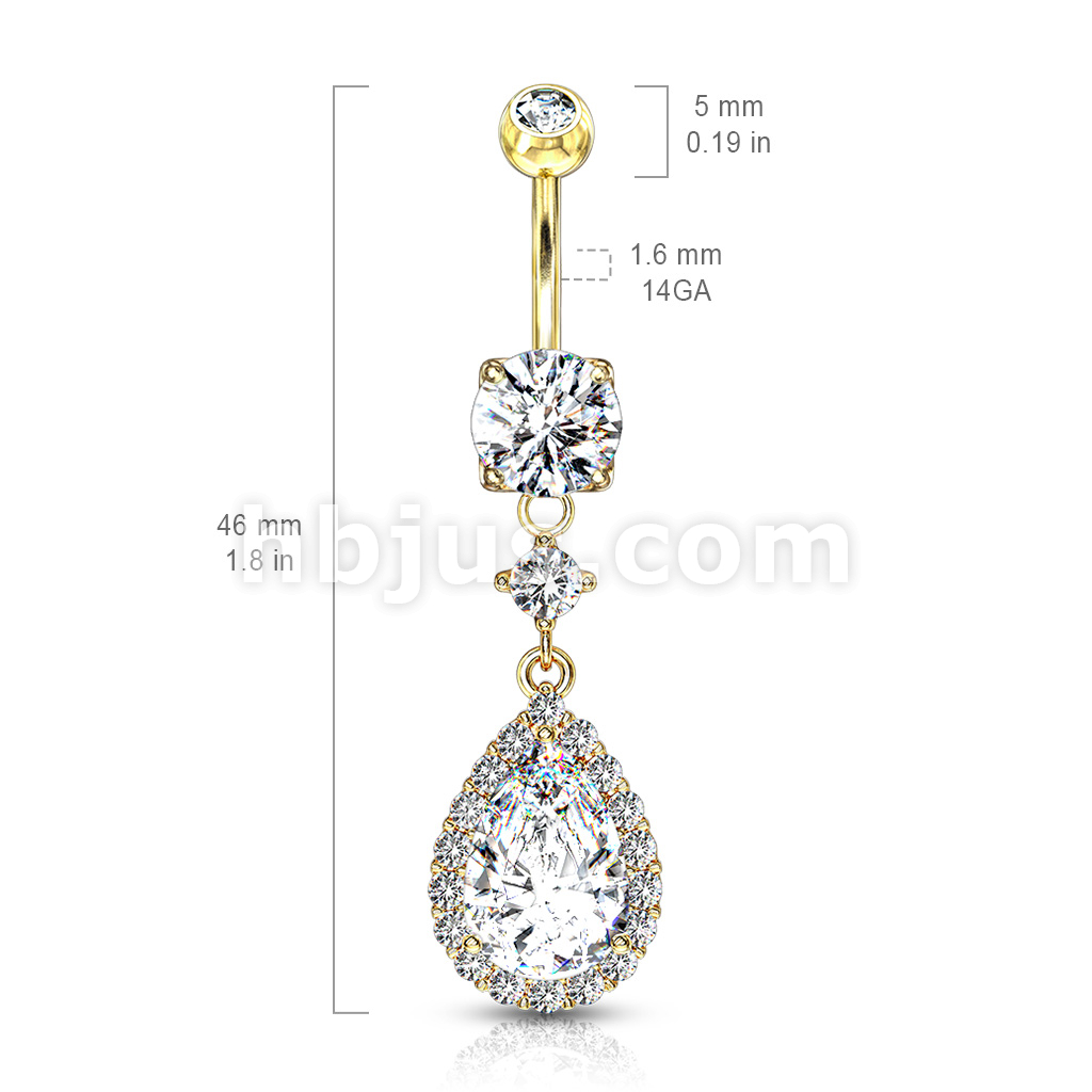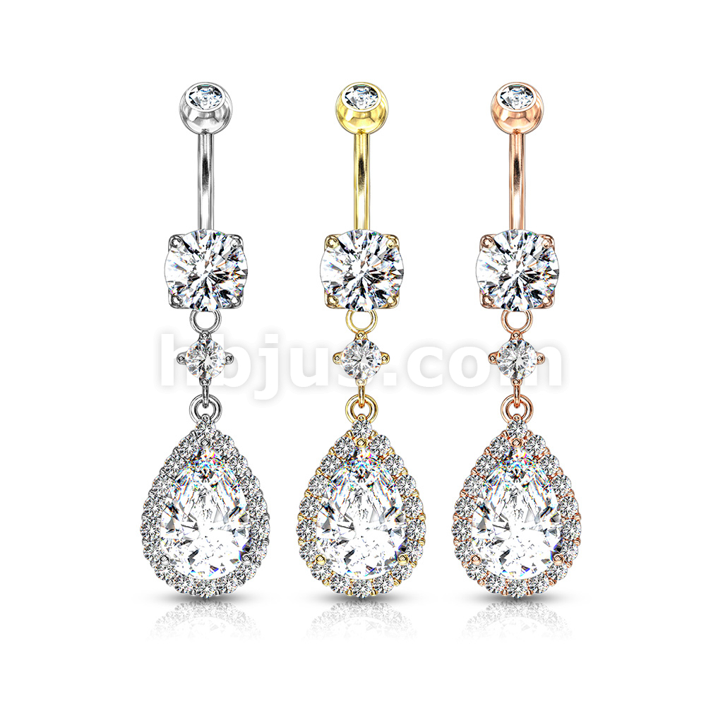 316L Surgical Steel Round CZ Prong Set With Large Tear Drop CZ With CZ Around Dangle Belly Button Ring
