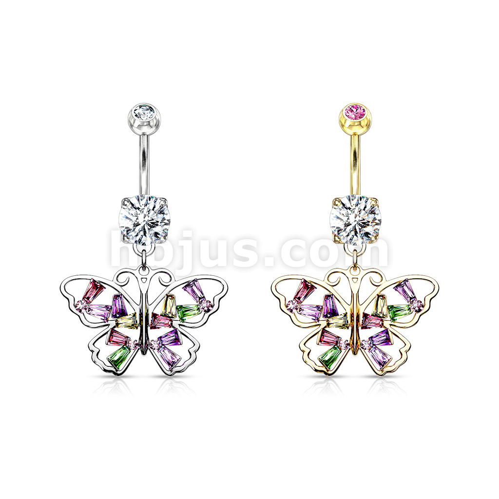 316L Surgical Steel Butterfly With Multi Colored Baguette CZ Wings Dangle Belly Button Ring