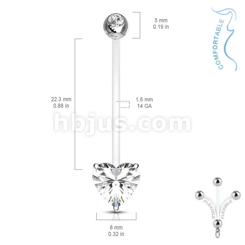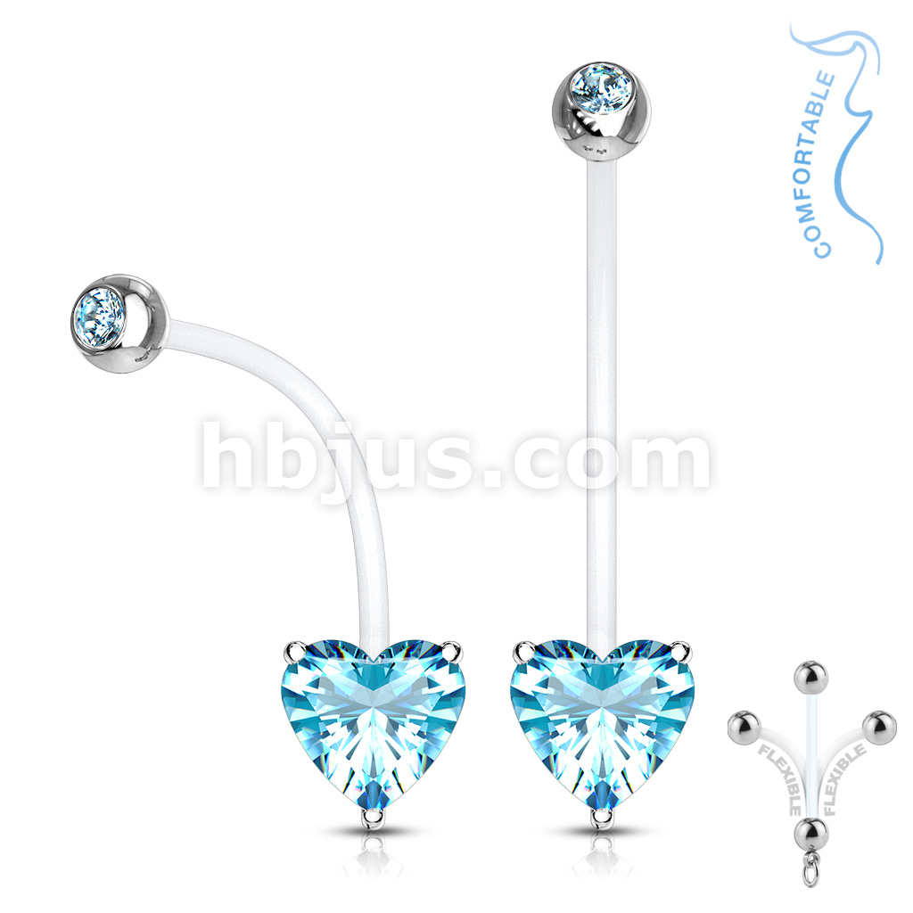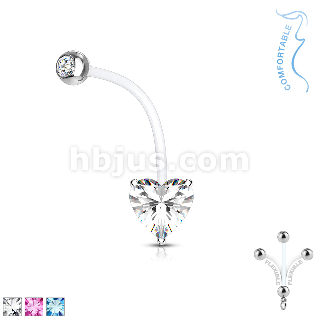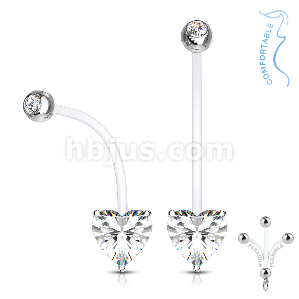 Double Jeweled Prong Set Heart CZ Pregnancy Belly Rings Bioflex with 316L Surgical Steel Balls