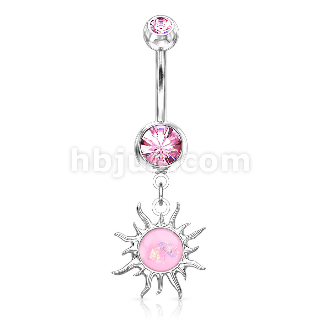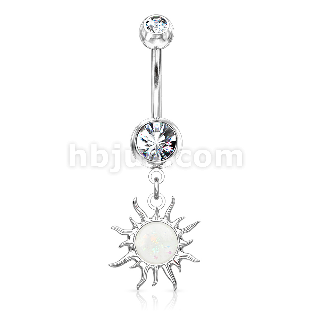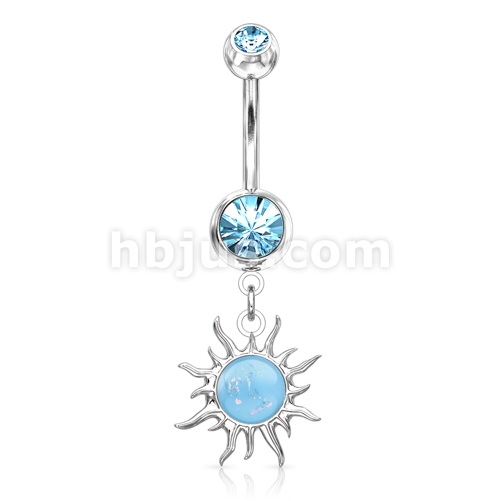 316L Surgical Steel Tribal Sun With Opal Glitter Center Dangle Double Jeweled Belly Button Ring