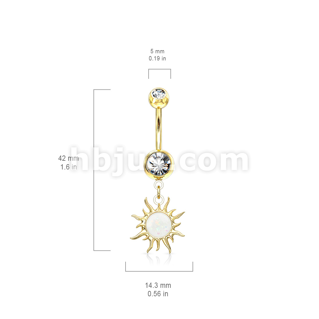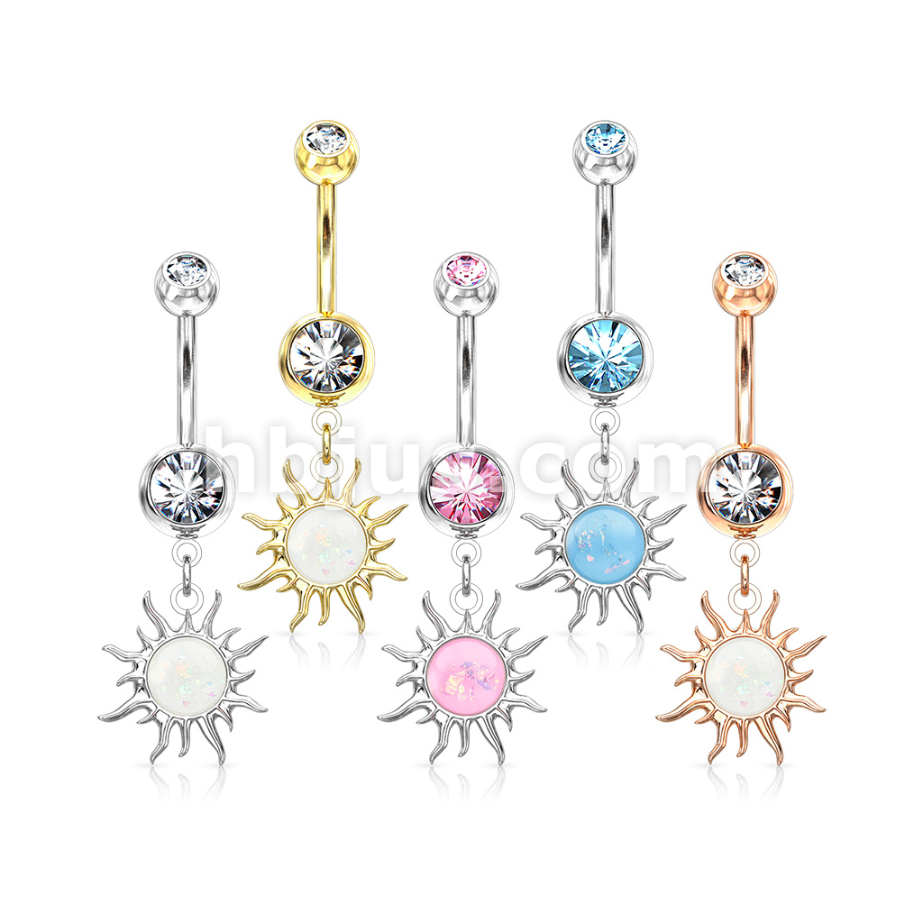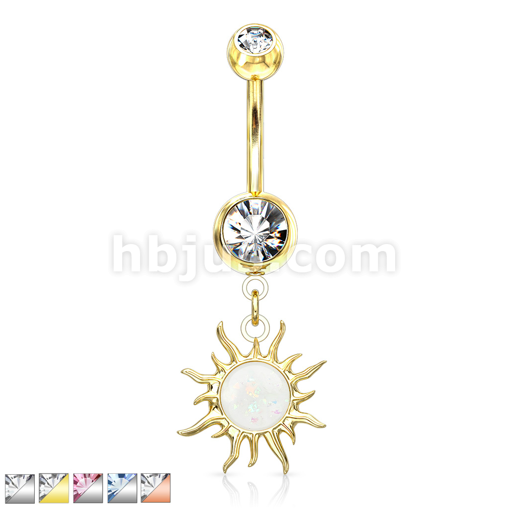 316L Surgical Steel Tribal Sun With Opal Glitter Center Dangle Double Jeweled Belly Button Ring