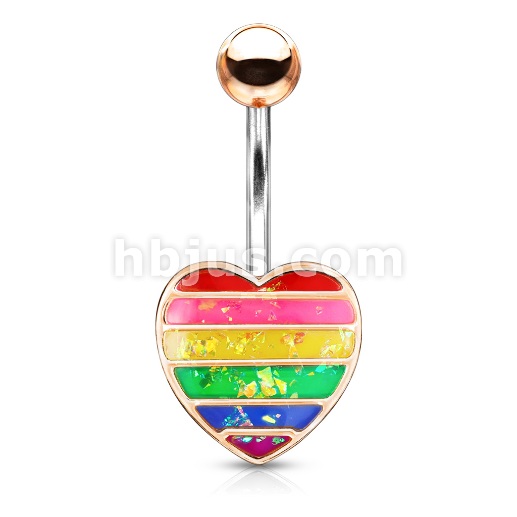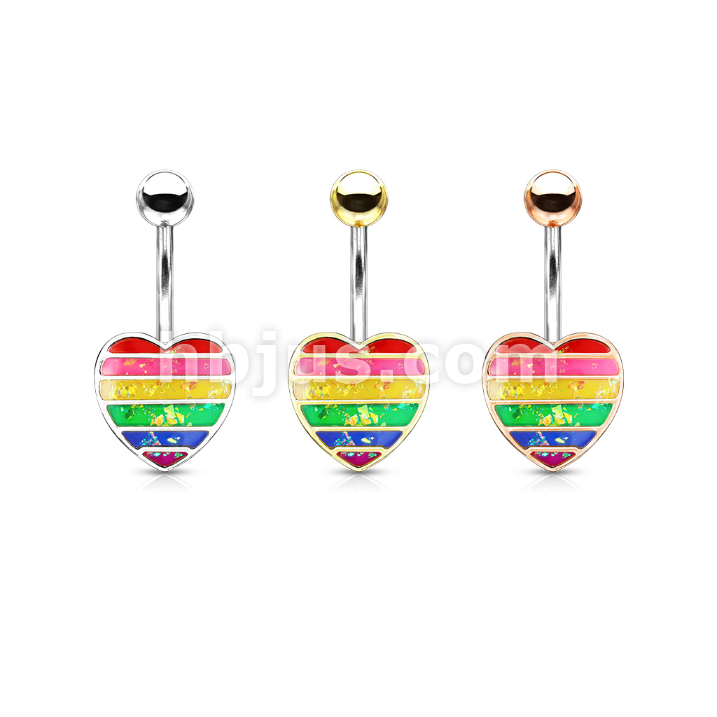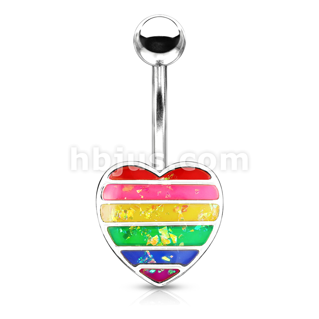 316L Surgical Steel Rainbow Opal Glitter Filled Heart Belly Button Ring