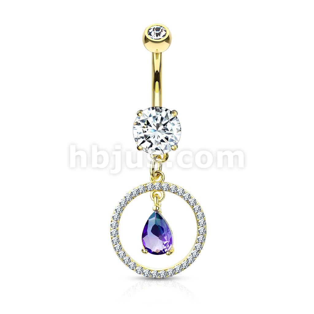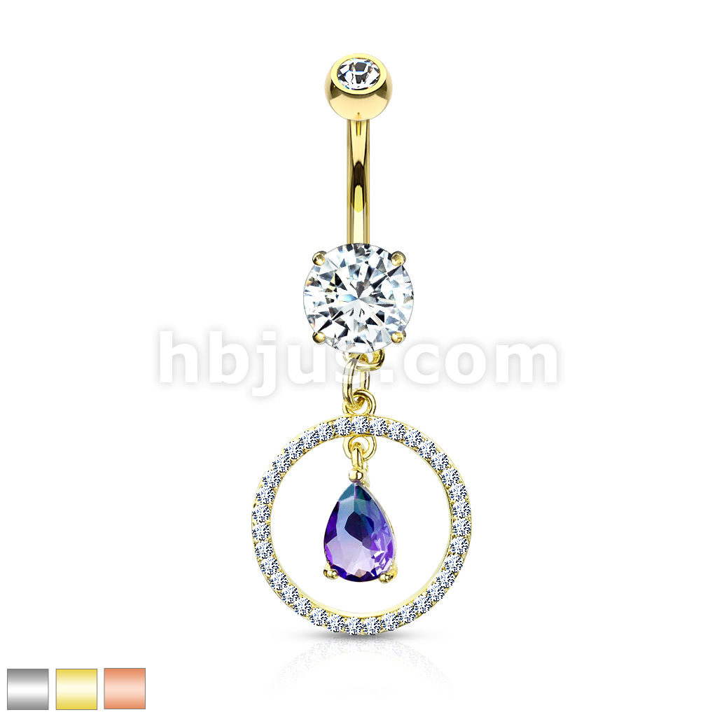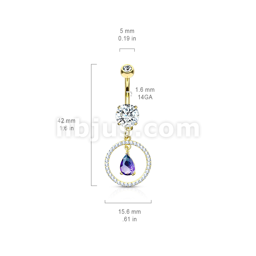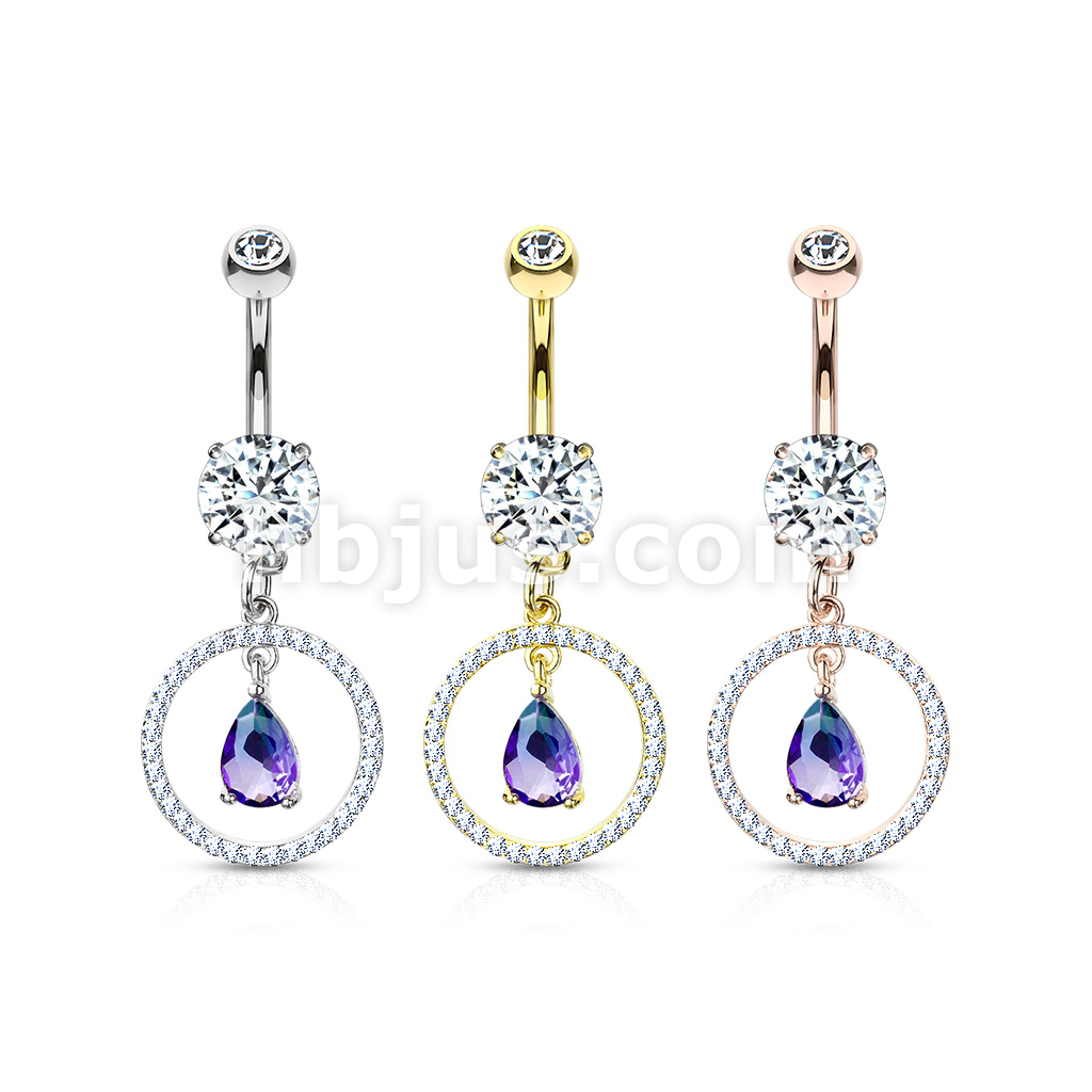 316L Surgical Steel CZ Paved Circle With Pear Shaped Green and Blue Two Tone CZ Dangle Double Jeweled Belly Button Ring