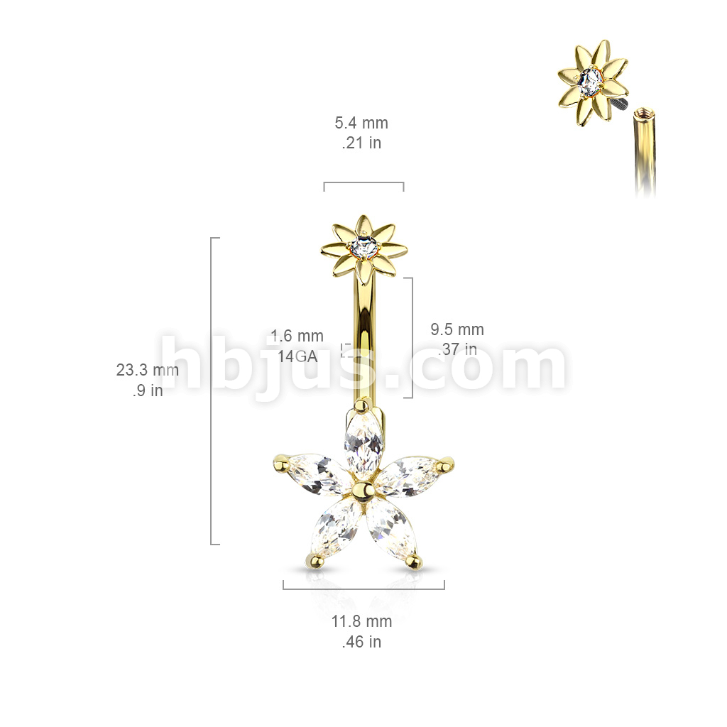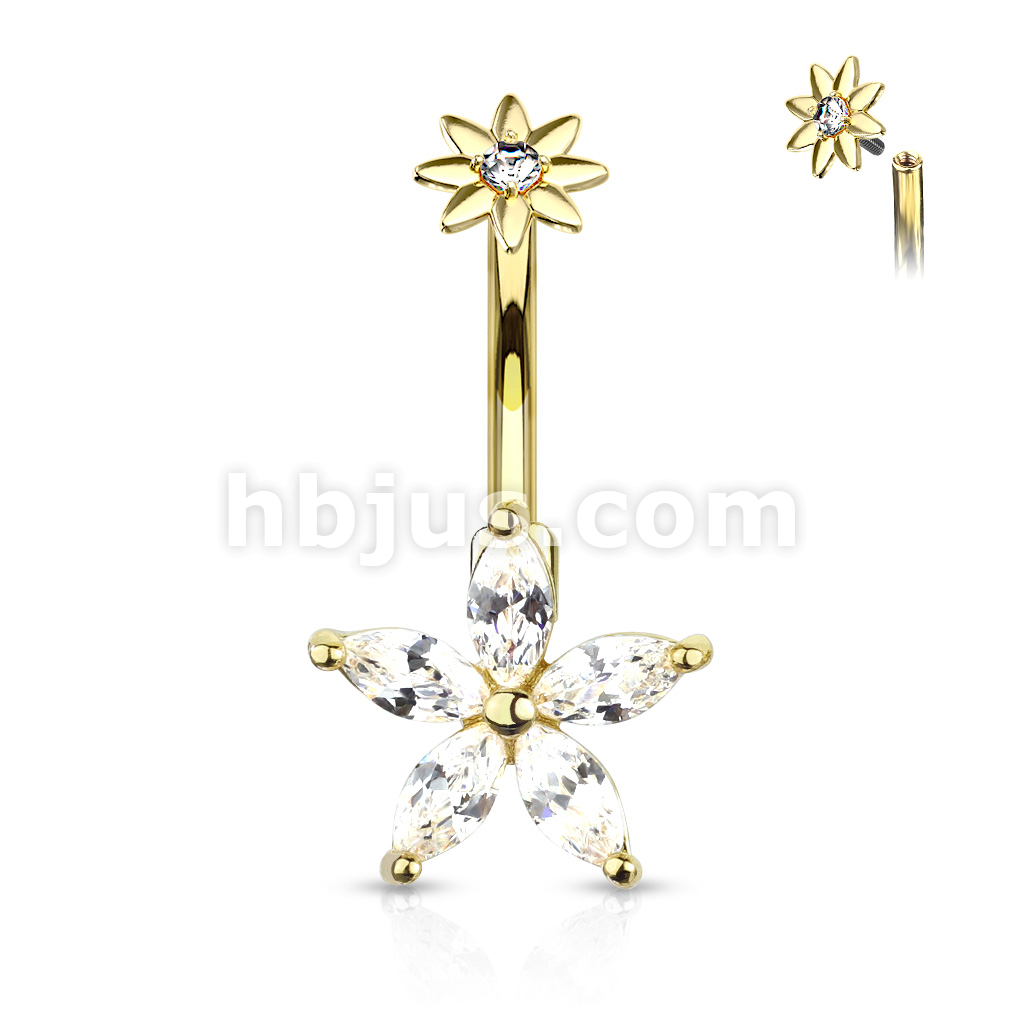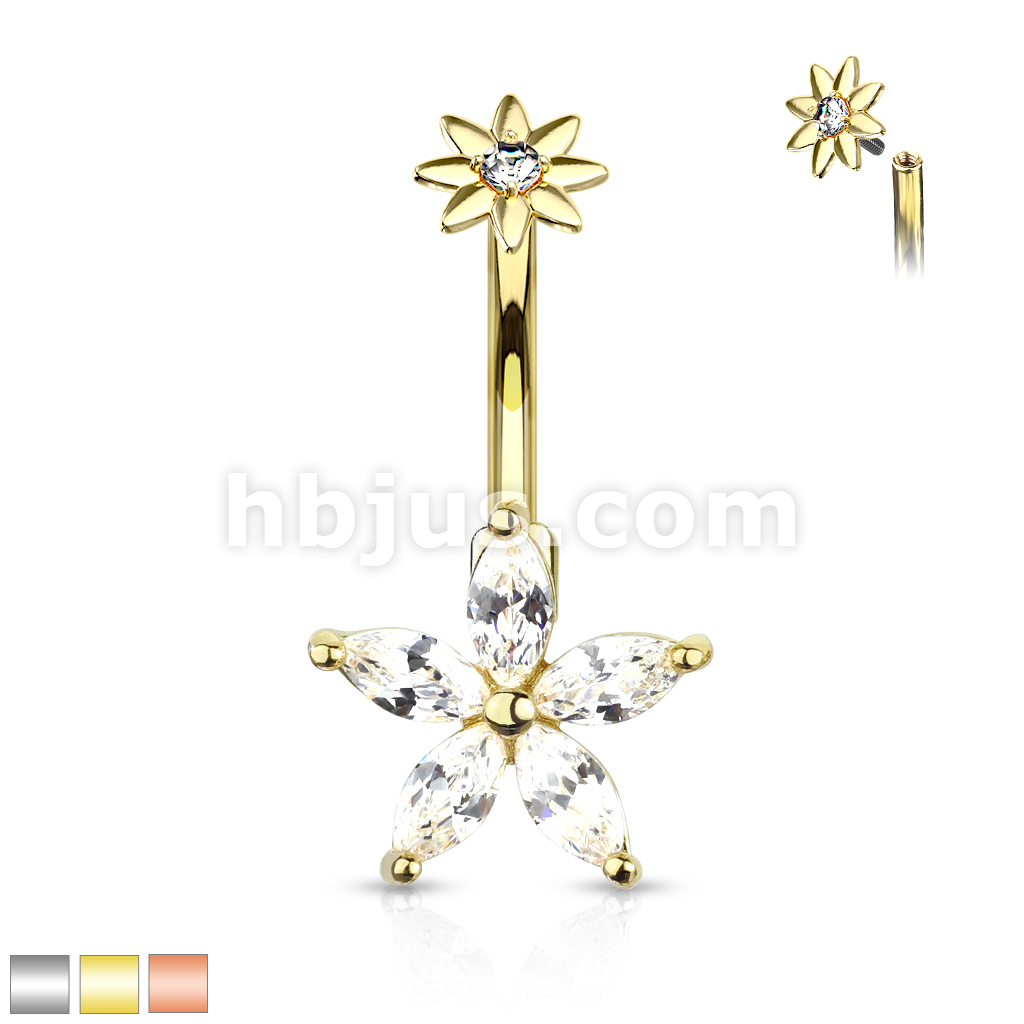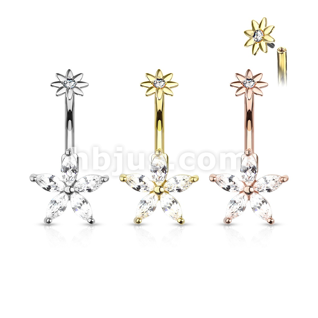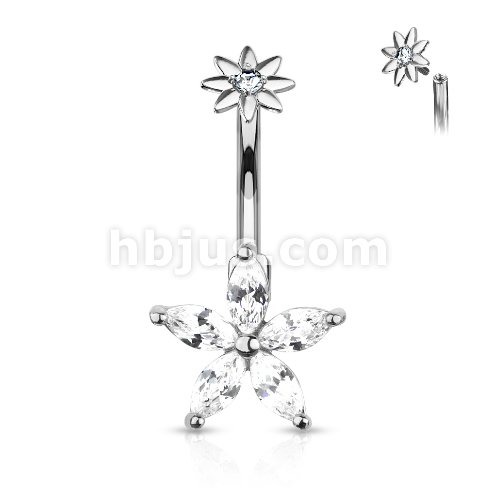 316L Surgical Steel 5 Marquise CZ Petals Flower With Internally Threaded CZ Center Small Flower Top Belly Button Ring