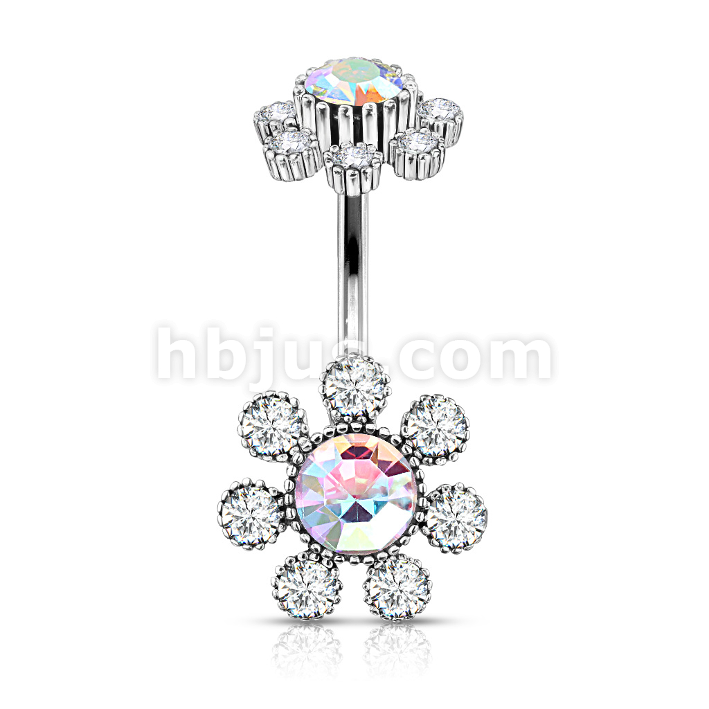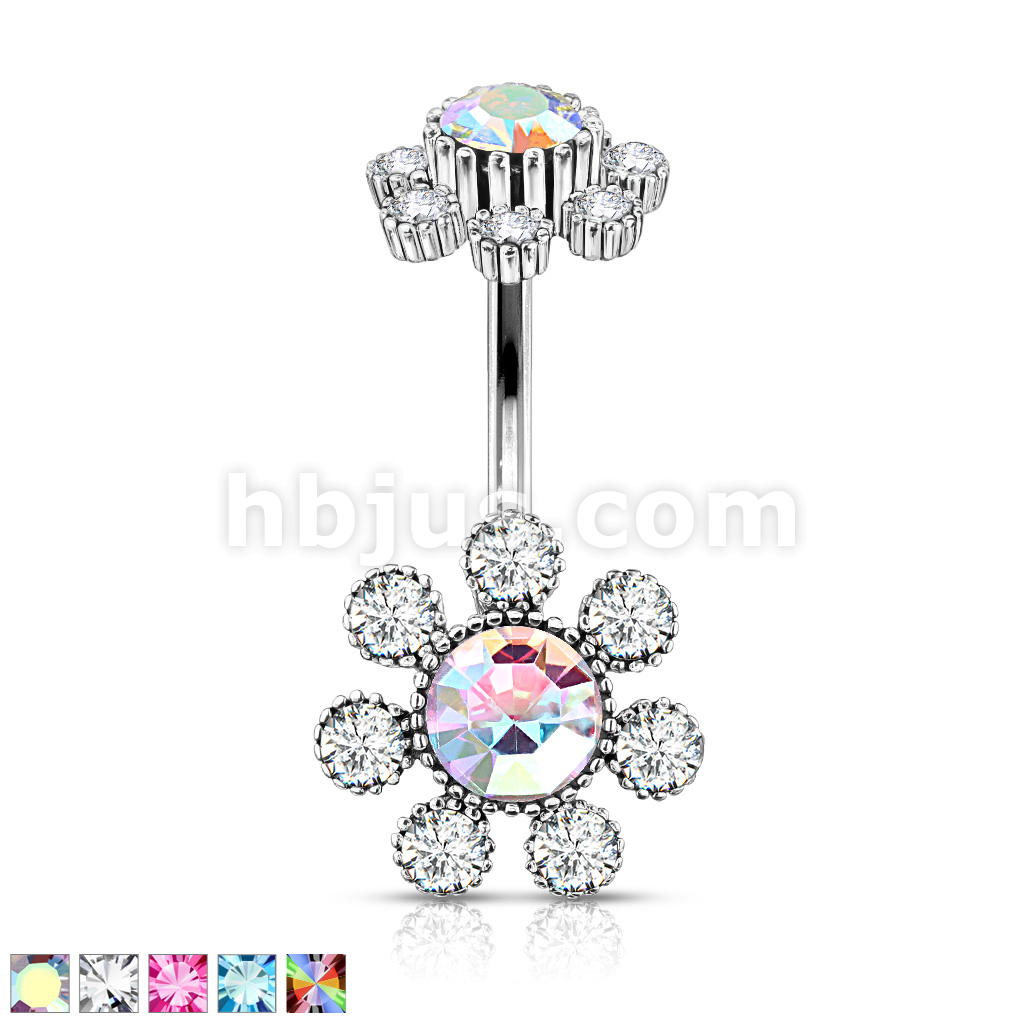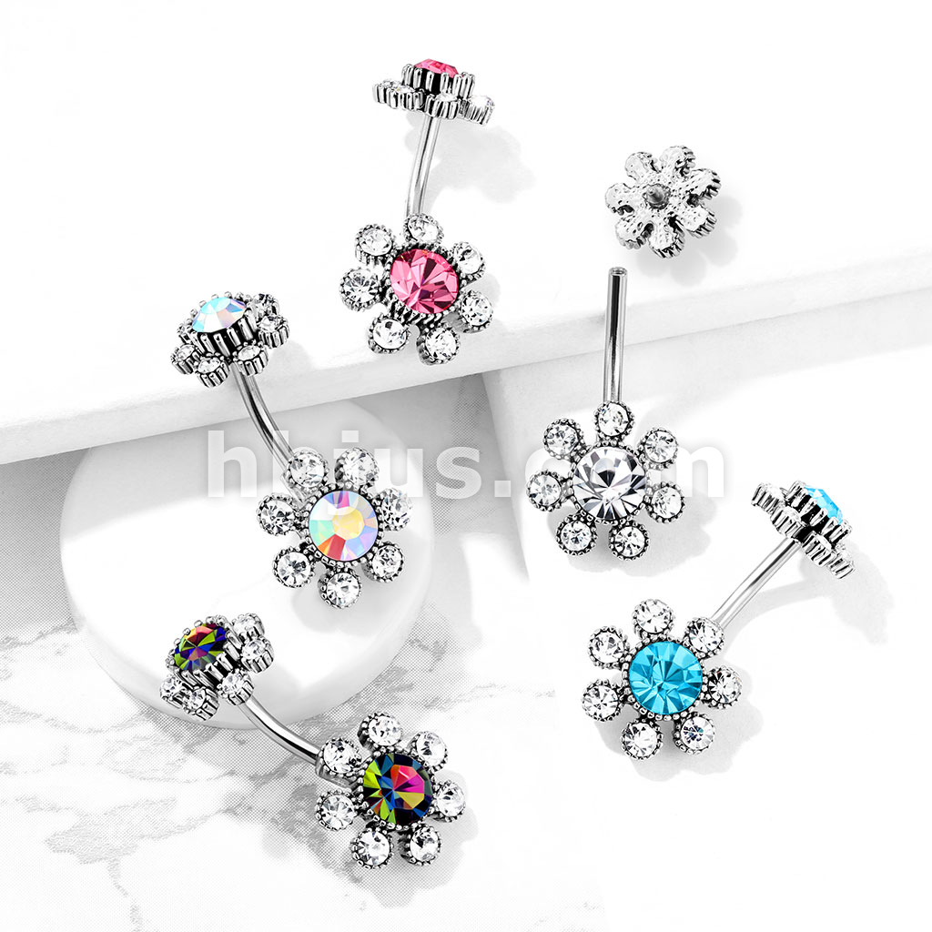 316L Surgical Steel Colored Gem Center and Clear Gem Petals Antique Silver Plated Flower With Internally Threaded Gemmed Flower Top Belly Button Ring