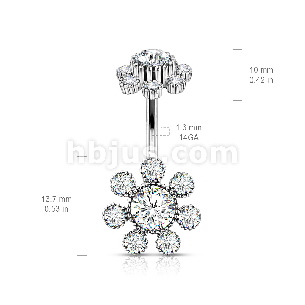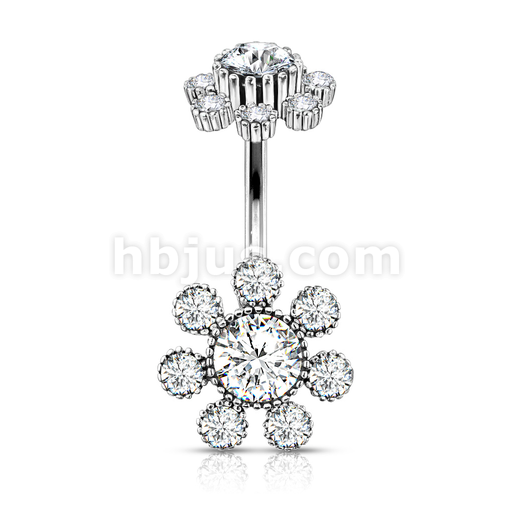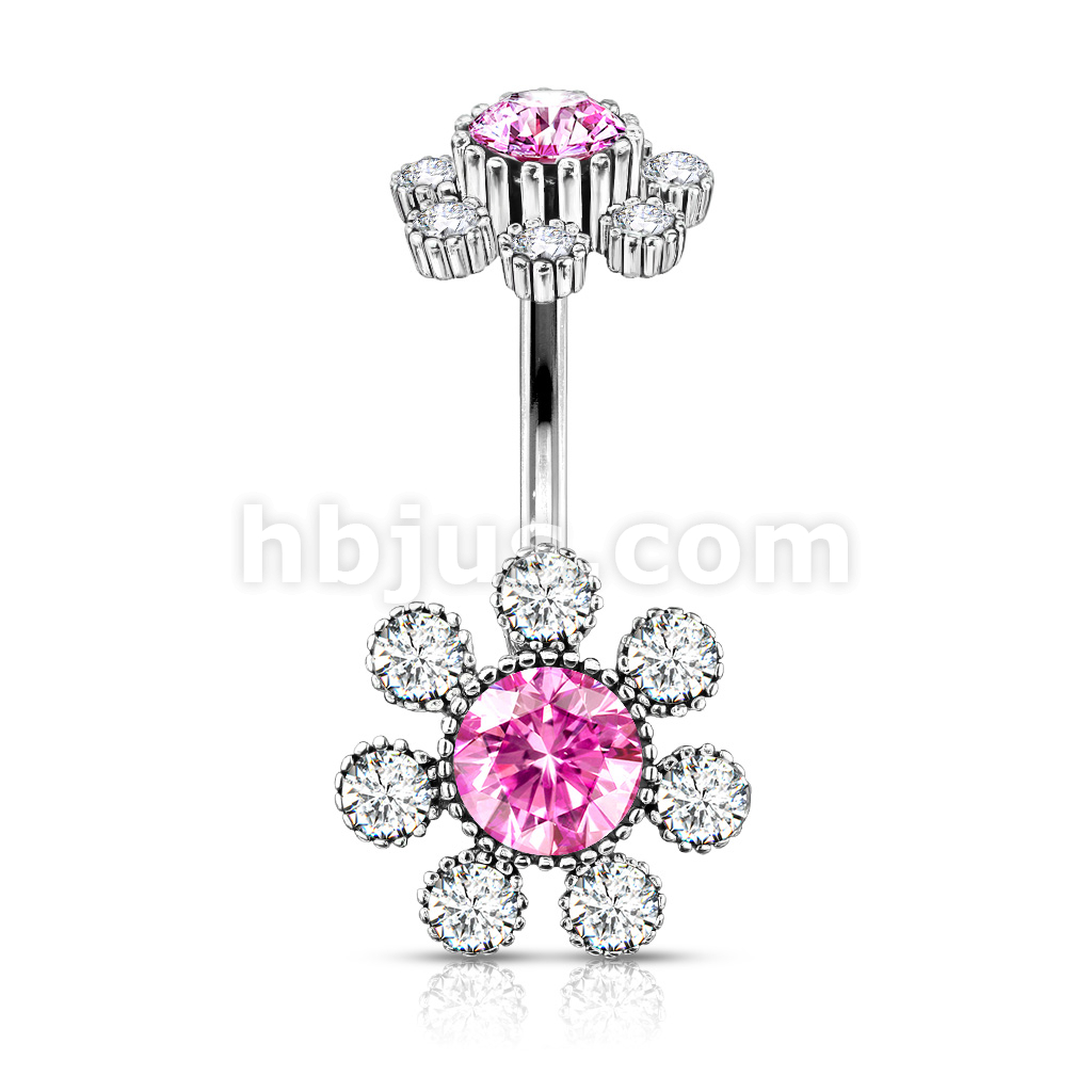 316L Surgical Steel Colored Gem Center and Clear Gem Petals Antique Silver Plated Flower With Internally Threaded Gemmed Flower Top Belly Button Ring